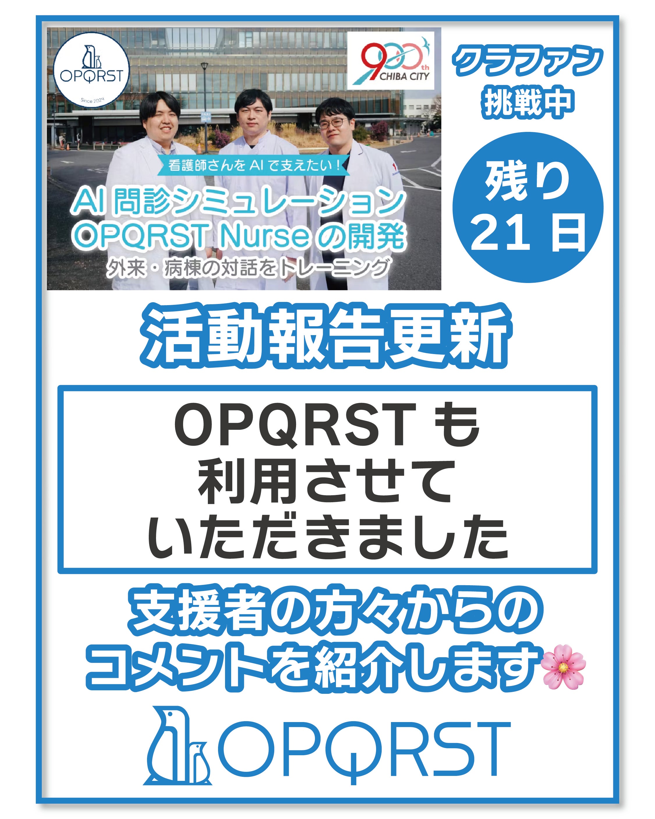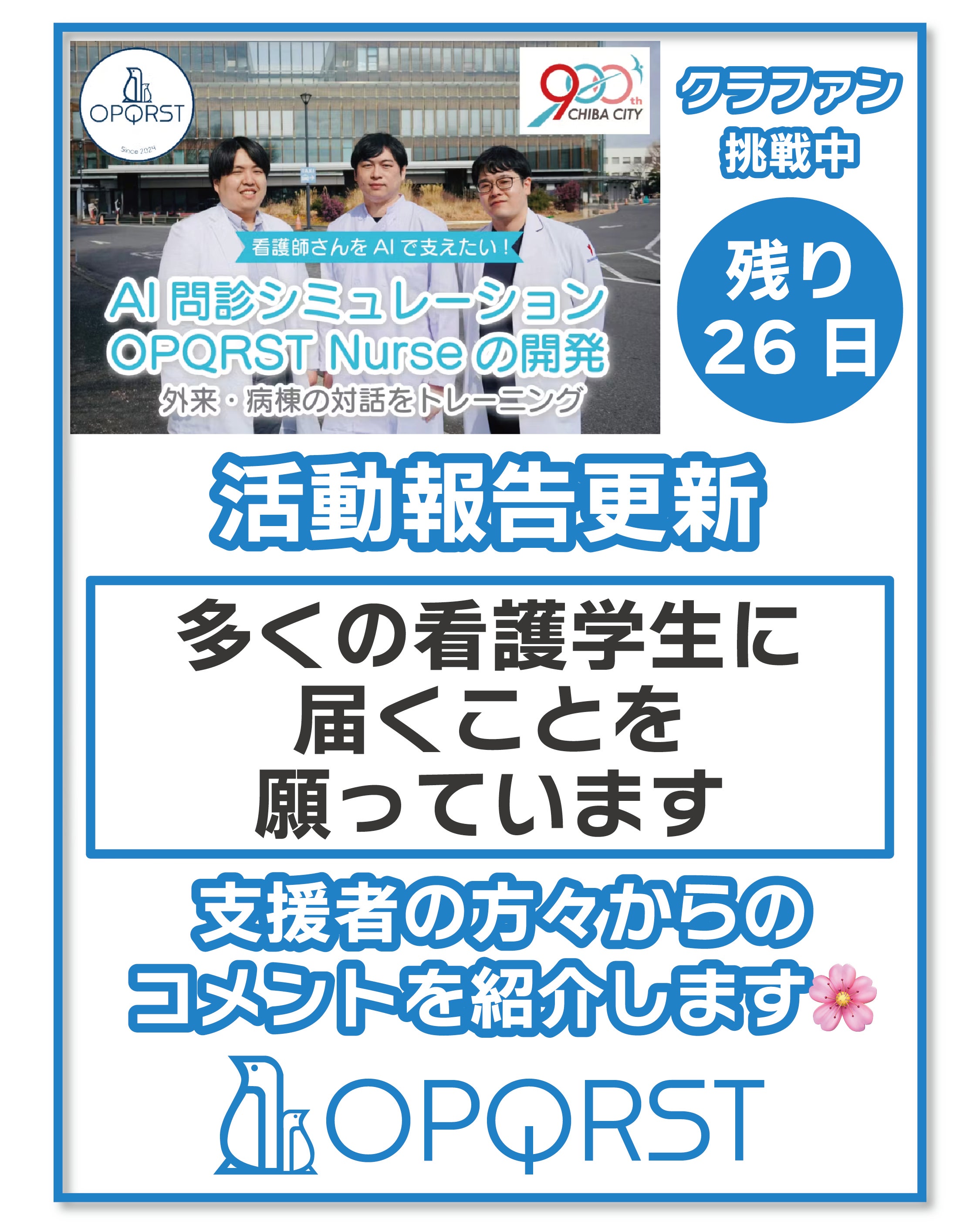 おはようございます、OPQRSTです!今日はさらにいただいている支援コメントをピックアップします!プロジェクトは残り1ヶ月を切りました。お陰様で、ご支援は45%を超えました。正直なところクラウドファウンディング初めてでやはり苦しいところもあります。私たちがいいと思っているサービスを知ってほしいのに、開発でうまくいかないところも正直あります。そんなときにいただいたメッセージは心の支えになってます。まじです。本当に、本当にありがとうございます!user_811fcfdfde34 様「AI問診シュミレーションを使うことによって、医療者の問診力がさらに向上すると良いですね!」ありがとうございます。医療者の問診力を鍛える方法に何がベストか、それは繰り返し問診すること、問診する内容の意味をしっかり考えること、そしてフィードバックを受けることだと思います。それらをコアに、皆様に手に取ってもらいやすいUIで、OPQRST Nurseの開発を行っています。私たちは医療者の問診力の向上が、そのまま日本の医療の質のさらなる向上にもつながると革新しています。皆様の応援を日本の医療の未来に繋げられるように、頑張ってまいります。ありがとうございます!6324b24ddea4 様「柳田先生、横川先生に病院実習でお世話になりました。実際に先生方の診療の様子を拝見し、OPQRSTも利用させていただきました。総合診療医として幅広い知識と深い洞察力を持ち、診断が難しく症状に悩む患者さんに寄り添い、診断に導く姿に感銘を受けました。臨床医としてだけではなく、起業して新しいサービスを作っていらっしゃるのも本当にすごいと思います。OPQRSTによって医学生の問診スキルはきっと向上していくと思いますし、看護学生も使えるようになってほしいと思います。頑張ってください!」ありがとうございます!病院実習に来ていただいた学生の方からメッセージを頂きました。こうやって改めてお話をいただくと、私たちが日頃から行っている教育の一つ一つが、日本の医療の未来を改善しているのだと、たいへん誇らしく、また嬉しく思います。私たちは大学病院での臨床・研究・教育のノウハウを、医学生・医師向けOPQRSTに詰め込みました。問診を教えることができるのは、問診を日頃から正確に行っている医師だけだと強く確信しています。私たちの強みが、そのままこのサービスには活かされています!学生の皆様の長い医療者の人生の中で、問診力を伸ばし続ける大事さに気がついたとき、その蕎麦にOPQRSTがあればいいなと思っています一緒に患者さんのために成長していきましょう!ありがとうございます!皆様のひとつひとつの支援がこのプロジェクトの成功につながります。皆様のご支援、本当にありがとうございます!!★★★★★★★★★★★★支援は残り1ヶ月を切りました。引き続き皆様の支援・シェアが大きな力になります。InstagramやXもぜひよろしくお願いします。https://www.instagram.com/opqrst_inc/https://x.com/OPQRST_Inc/