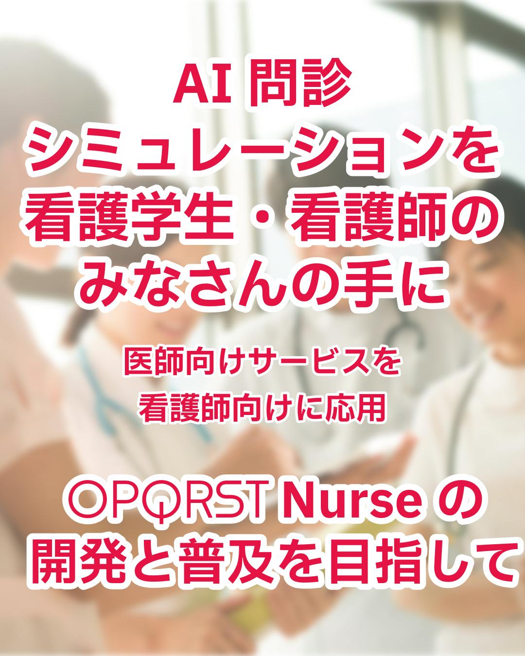 私たちはこのプロジェクトを通して、医師向けAI問診シミュレーションサービス「OPQRST」をもとに、看護学生・看護師さんを対象にした「OPQRST Nurse」を開発し、多くの方の手にわたることを目指しています。