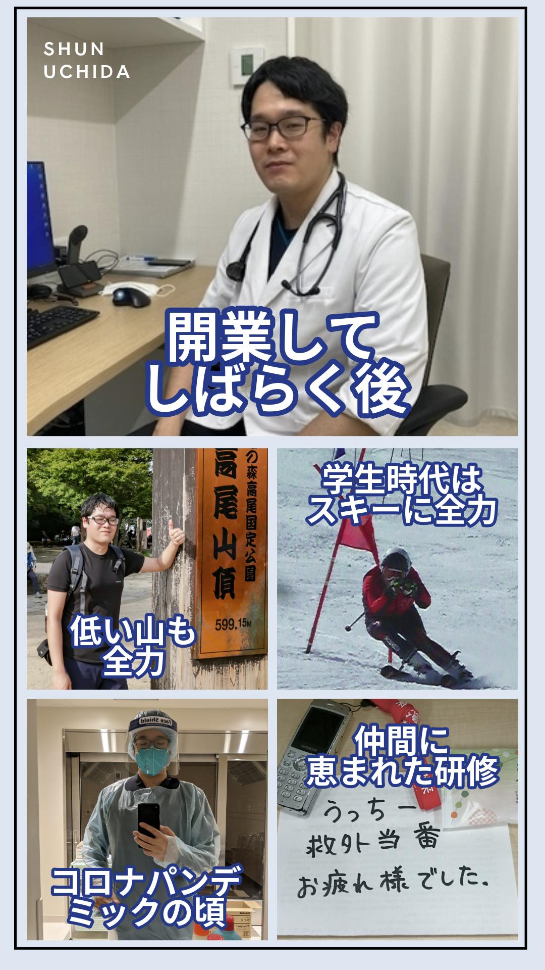 その後、福井大学医学部へ進学しました。福井大学では家庭医療の先生の「聞くちから」に感銘を受けました。初期研修では東京に戻り、救急外来を中心に幅広く学び研修しました。