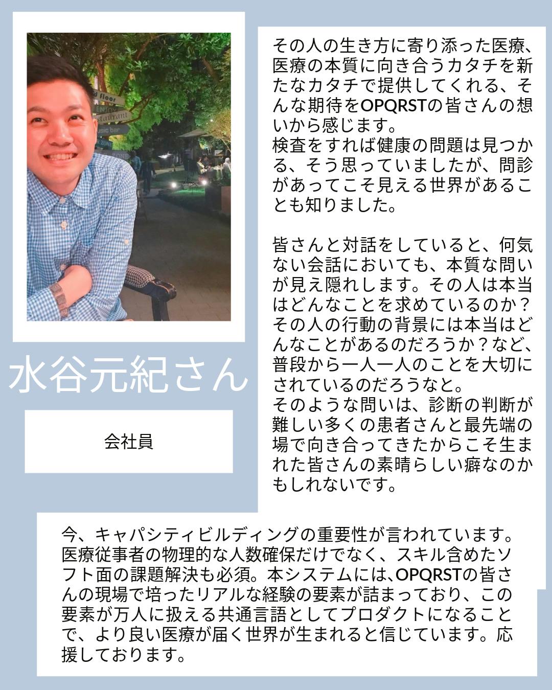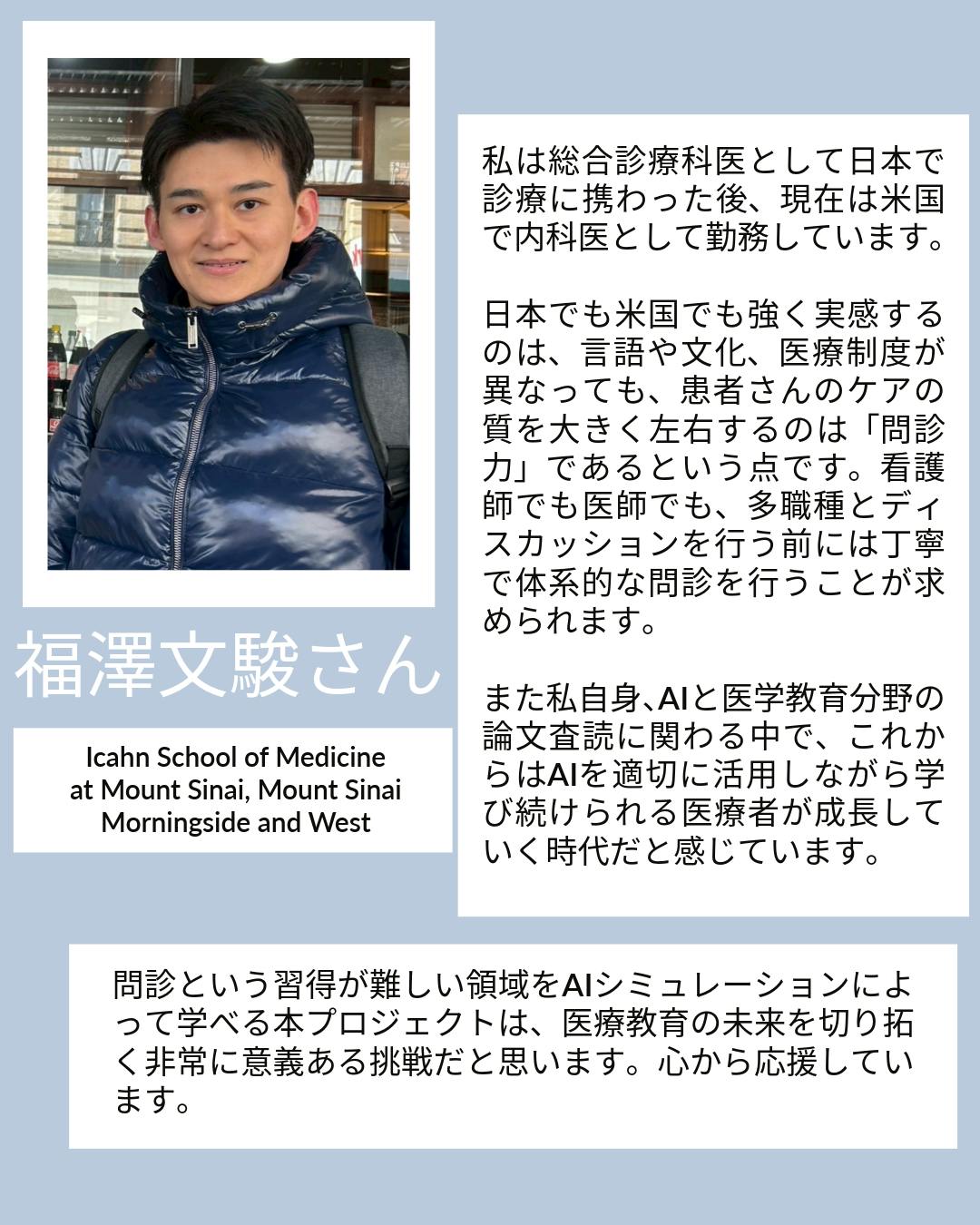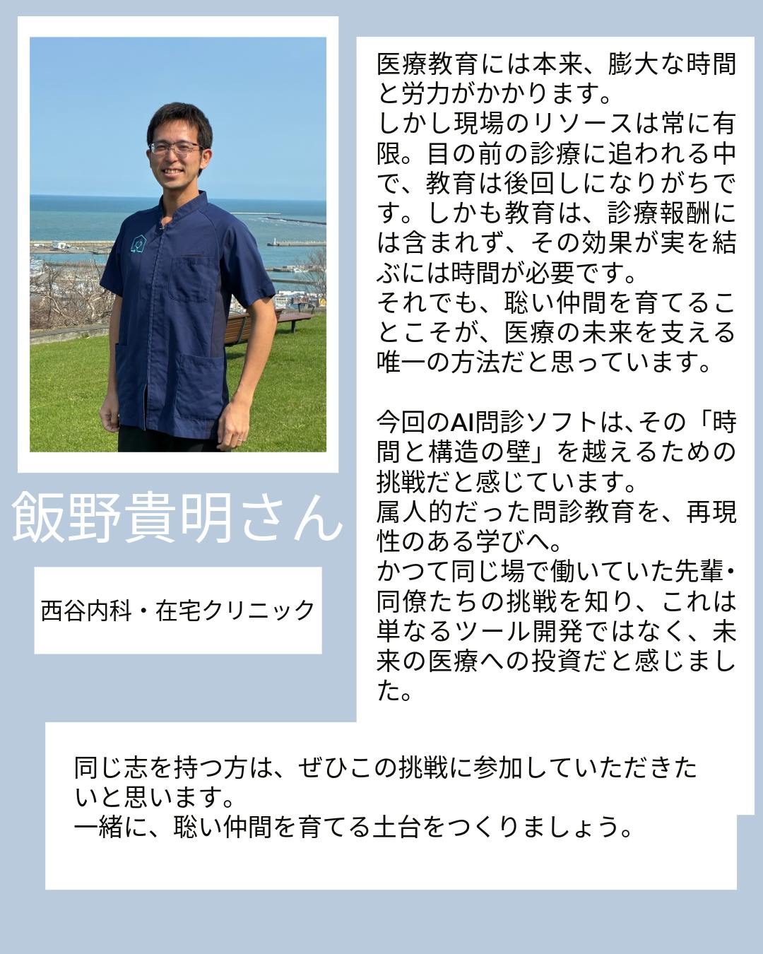 2026/03/05 07:00おはようございます、OPQRSTです3月1日から始まって今日で5日目になりました!ここまで17名に応援してもらえました。支援してくださった皆様、ありがとうございます。皆様からいただいたメッセージやコメントを紹介させていただく中で、私たちの思いを伝えていきたいと思います。応援メッセージ:西谷内科・在宅クリニック 飯野 貴明さん今日はプロジェクトの開始にあたって、直接いただいた応援メッセージをご紹介させてください。今回は西谷内科・在宅クリニックの飯野貴明さんです。実は飯野先生とは、以前同じ現場で働いていたことがあります。忙しい現場の中でも、若い人の成長や教育のことをいつも真剣に考えている先生で、今回こうして応援メッセージをいただけたことを、とても嬉しく思いました。飯野さんのメッセージの中で、特に印象に残った言葉があります。医療教育には本来、膨大な時間と労力がかかります。それでも、聡い仲間を育てることこそが、医療の未来を支える唯一の方法。医療の現場では、どうしても目の前の診療が優先になります。教育は大事だと分かっていても、時間も余裕も足りない。きっと多くの現場で、同じ悩みがあると思います。それでも、次の世代を育てることを諦めたくない。そして、ひとを育てる自分の時間も大事にしたい。このプロジェクトは、そんな思いを助けたいという思いから始まりました。いただいたメッセージはこちらからぜひ御覧ください挑戦することを続ける飯野さんとは仕事以外でもとても仲良くしてくれました。時に一緒にゲームをしたり、ボードゲームを作ったり。挑戦し続ける飯野さんの姿勢がとても素敵だと思っています。今回の私たちの挑戦は、私たちにこれまで関わってくださった皆様との関係の延長線上にあるのだと、再確認できました。AIを使って、属人的になりがちな問診教育を、誰でも学べる形にできないか。現場の忙しさの中でも、少しでも教育を支えられる仕組みを作れないか。そんな私たちの挑戦をこれからも続けていきます。仲間がこうして同じ方向を見て応援してくれていることに、なんだか背中を押してもらったような気持ちになりました。ありがとうございます! もっと見る
