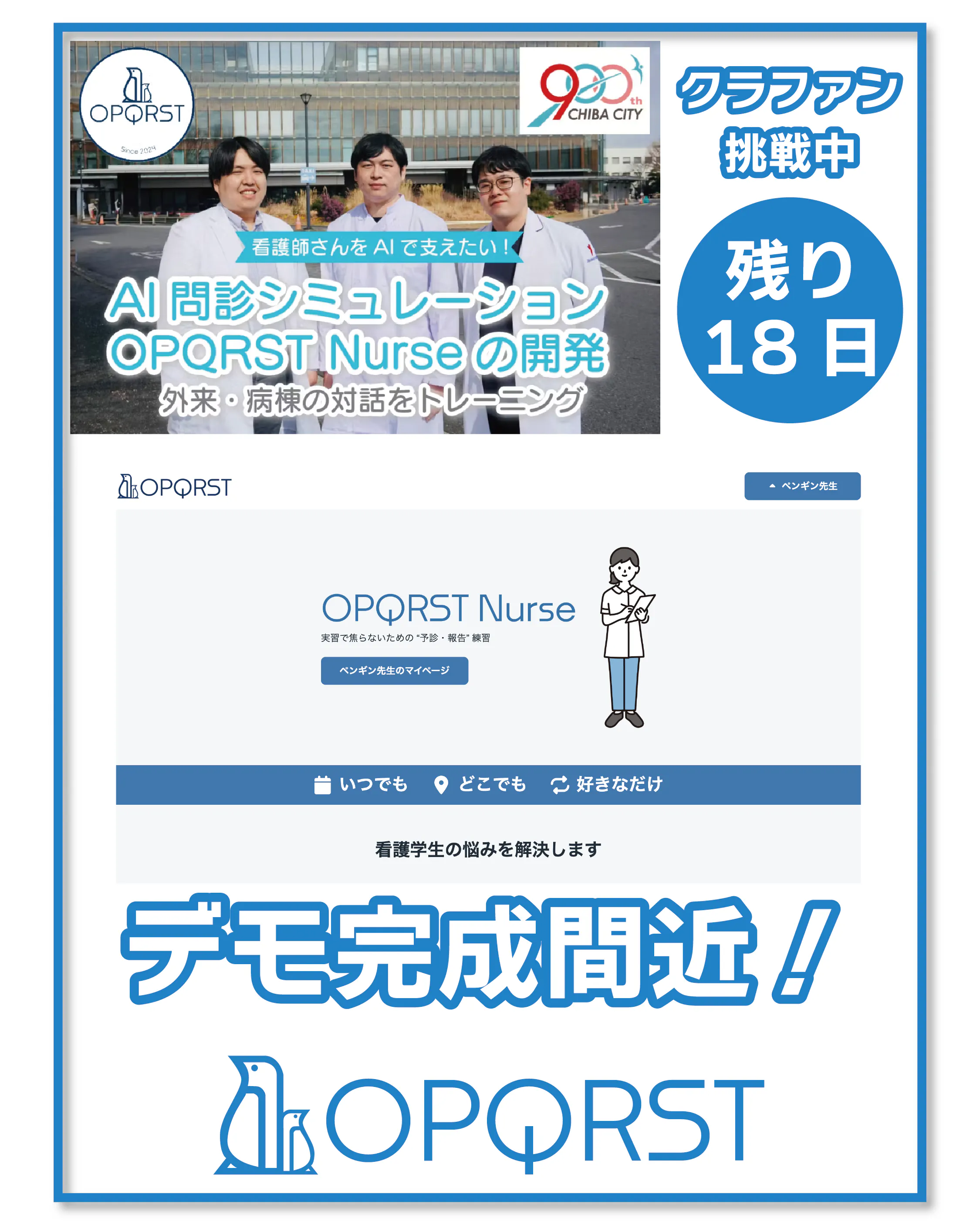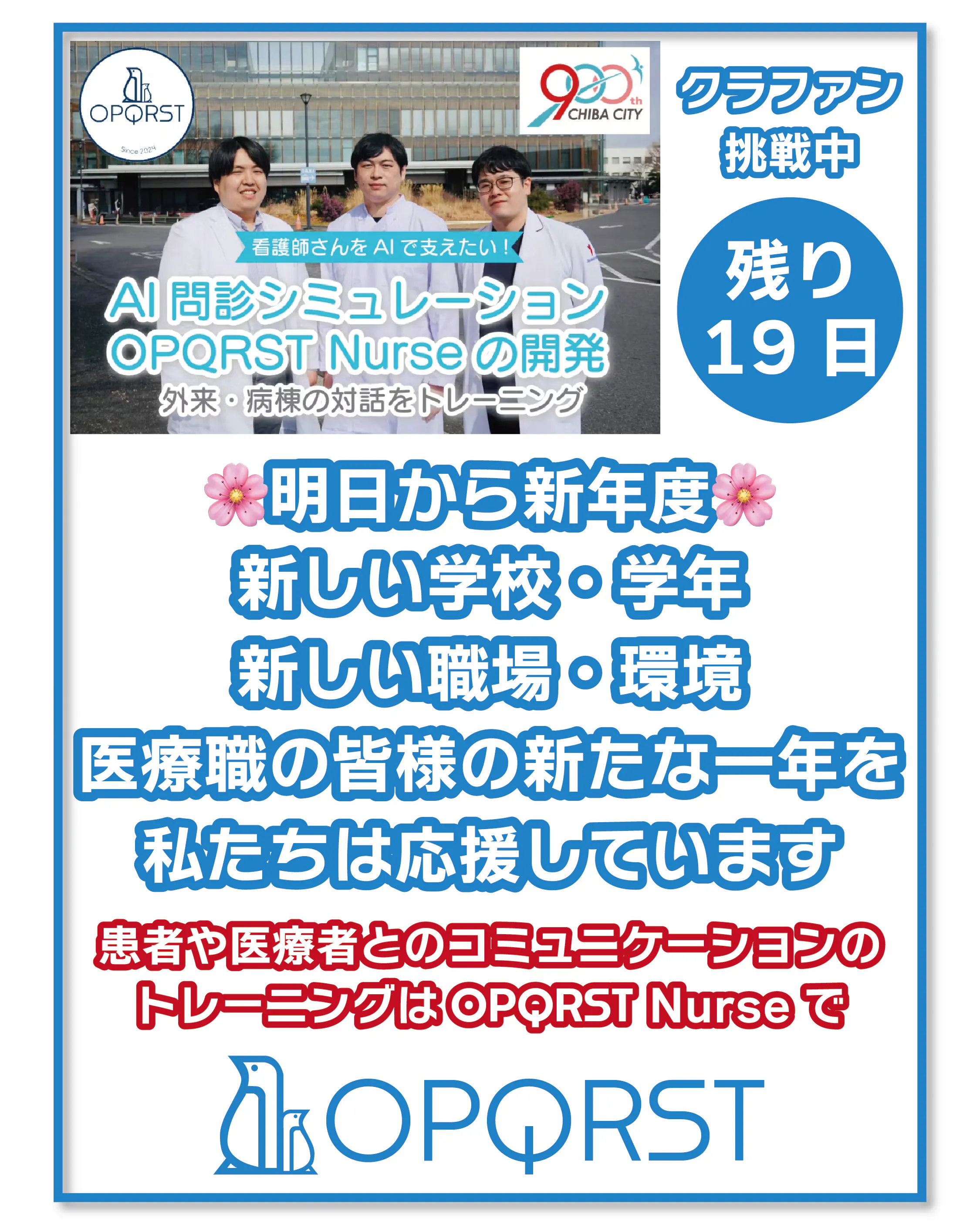 2026/04/01 07:25おはようございます、OPQRSTです今日から新年度ですね当社の中でも新年度で少し状況が代わるスタッフがおりまして、久しぶりにワクワクする新年度を迎えているようです本日は皆様にもワクワクをお届け!OPQRST Nurseのデモ版が完成間近となりました!現在は、ユーザーインターフェースの設計が終盤を迎え、肝となる問診AI部分の最終調整に入っています。進捗をまた報告したいと思います。ご支援いただいた方、ぜひ引続き応援をよろしくお願いします!★★★★★★★★★★★★支援は残り20日を切りました。引き続き皆様の支援・シェアが大きな力になります。InstagramやXもぜひよろしくお願いします。https://www.instagram.com/opqrst_inc/https://x.com/OPQRST_Inc/ もっと見る