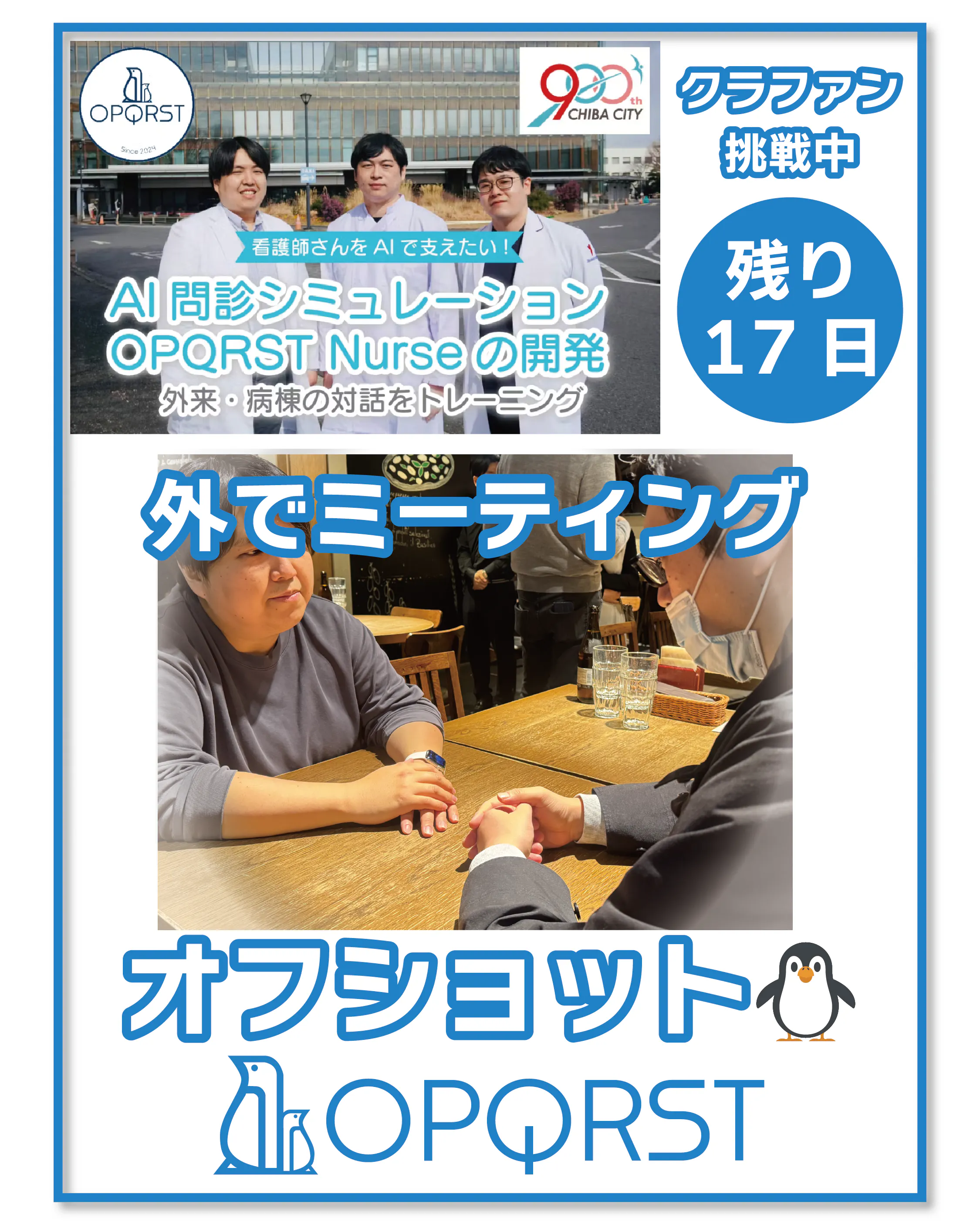 2026/04/02 07:00おはようございます!OPQRSTです新年度、みなさんはいかがでしたか?我々は昨年度よりはそれぞれ少しずつ忙しくなっています。このプロジェクトも中盤戦ですが、負けずに開発を続けています!先日、メンバーでお外でミーティング(?)を行いました現在の進捗確認に加え、どのようなシナリオがよいのかなどなど検討しました(会話はイメージです、本当はもっと深い話をたくさんしました笑)看護学生はじめ、みなさまの声を参考に一歩ずつすすめ、より良い「OPQRST Nurse」を形にしていっています。顔出しが恥ずかしい我々ですが、活動が少しでも伝わるよう活動報告を続けていきます引き続き、応援・SNSでのシェアよろしくおねがいします。インスタグラムもぜひフォローしてください!★★★★★★★★★★★★支援は残り20日を切りました。引き続き皆様の支援・シェアが大きな力になります。InstagramやXもぜひよろしくお願いします。https://www.instagram.com/opqrst_inc/https://x.com/OPQRST_Inc/ もっと見る
