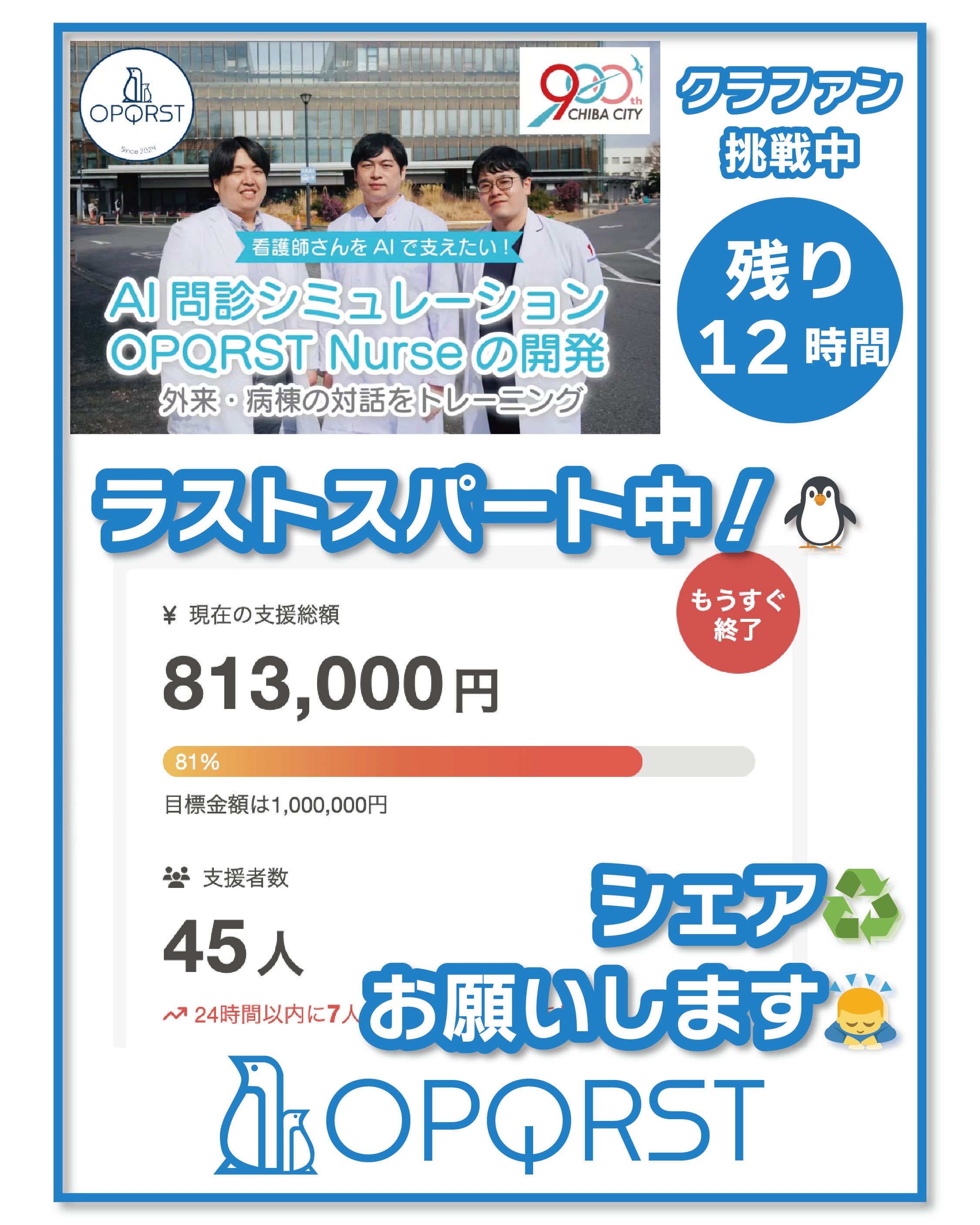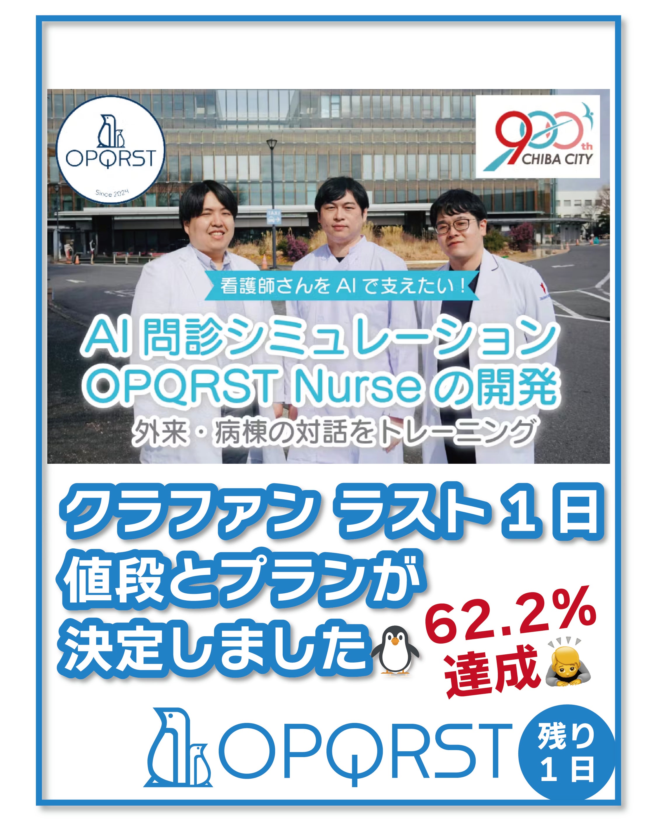 2026/04/19 08:54おはようございます、OPQRSTです。いよいよ本日はクラファン最終日です。終了を前に支援が増えております!現時点で41名、今朝も3件のご支援を頂きました!最後に向かってラストスパートです。本日の23:59までご支援可能です。シェアやご支援よろしくお願いします!★★★★★★★★★★★★シェアはこちらをコピペ↓↓↓【本日最終日】看護学生・看護師さんの問診力を鍛える、AI問診『OPQRST Nurse』の開発を応援しています!URLから支援・シェアをお願いします!https://camp-fire.jp/projects/919369/view★★★★★★★★★★★★私たちのグランドデザイン、夢私たちのグランドデザインの核心は、生成AI技術を駆使して医療の原点である「問診」の質を世界規模で標準化し、すべての患者さんが安心して医療を受けられる未来を創造することです。かつて属人的な経験や限られた機会に依存していた問診スキルの習得プロセスを、AI模擬患者プラットフォーム「OPQRST」シリーズによる日常的な反復練習へと転換します。決して現在の模擬患者に代替するものではありません。人間と人間でしかできないコミュニケーションに多くの意味があります。しかし、例えばパイロットのフライトシミュレーター、自動車免許のドライブシミュレーターがあるのに、どうして医療者の問診シミュレーターは無いのでしょうか。今のAI技術と、私たちの努力が、これを可能にします。私たちの最終的な夢は、AIによる医師の代替ではなく、AIによって鍛え抜かれた医療者が、患者さんの前でこれまで以上に「人間らしく」振る舞える世界を作ることです。十分な対話スキルを持つ医療者が増えることで、患者さんが納得感と安心感を持って治療に臨める温かな医療社会を、千葉大学発ベンチャーとして一歩ずつ着実に社会実装してまいります。★★★★★★★★★★★★最終日はSNS投稿を増やしてお届けしますInstagramやXもぜひよろしくお願いします。https://www.instagram.com/opqrst_inc/https://x.com/OPQRST_Inc/★★★★★★★★★★★★ もっと見る