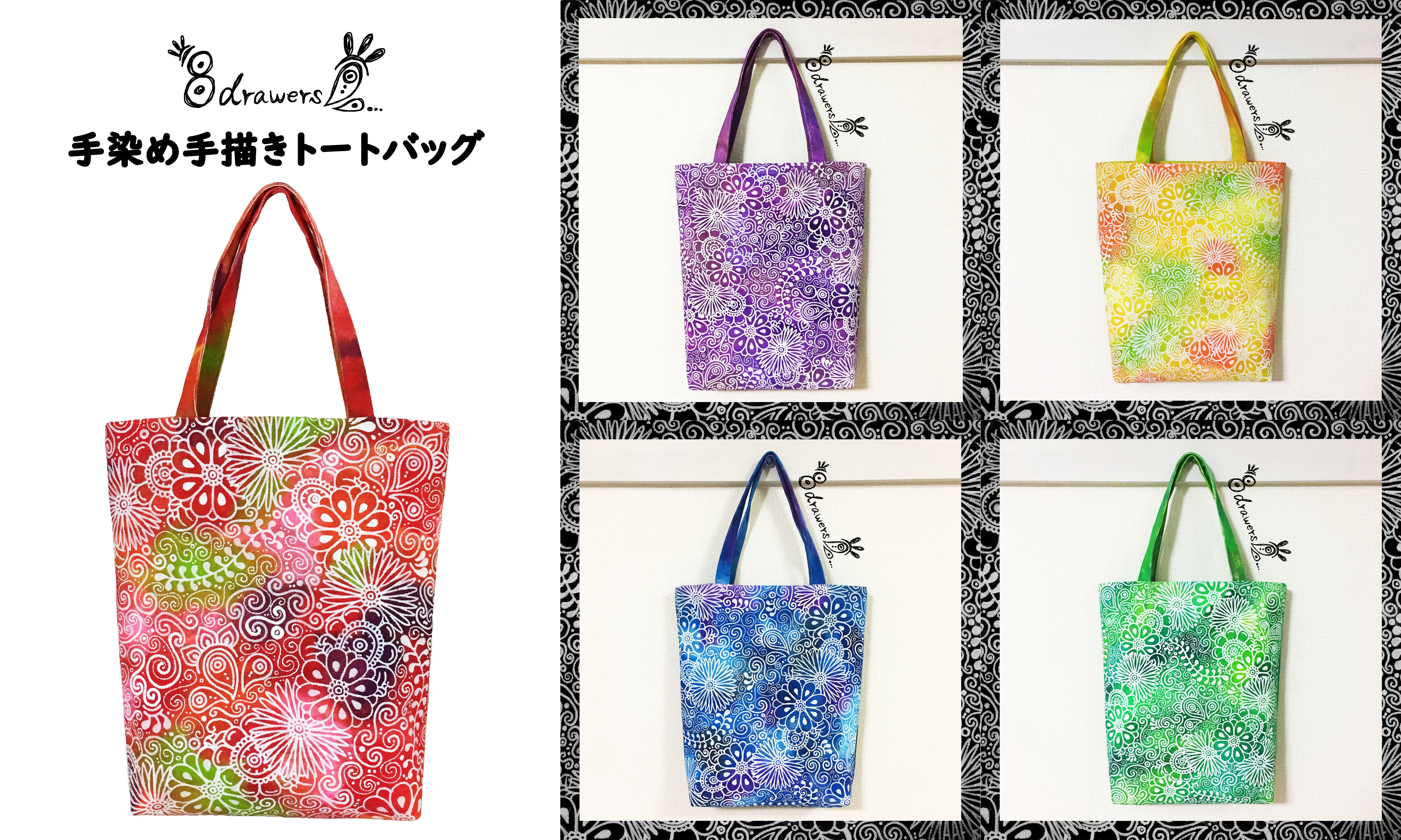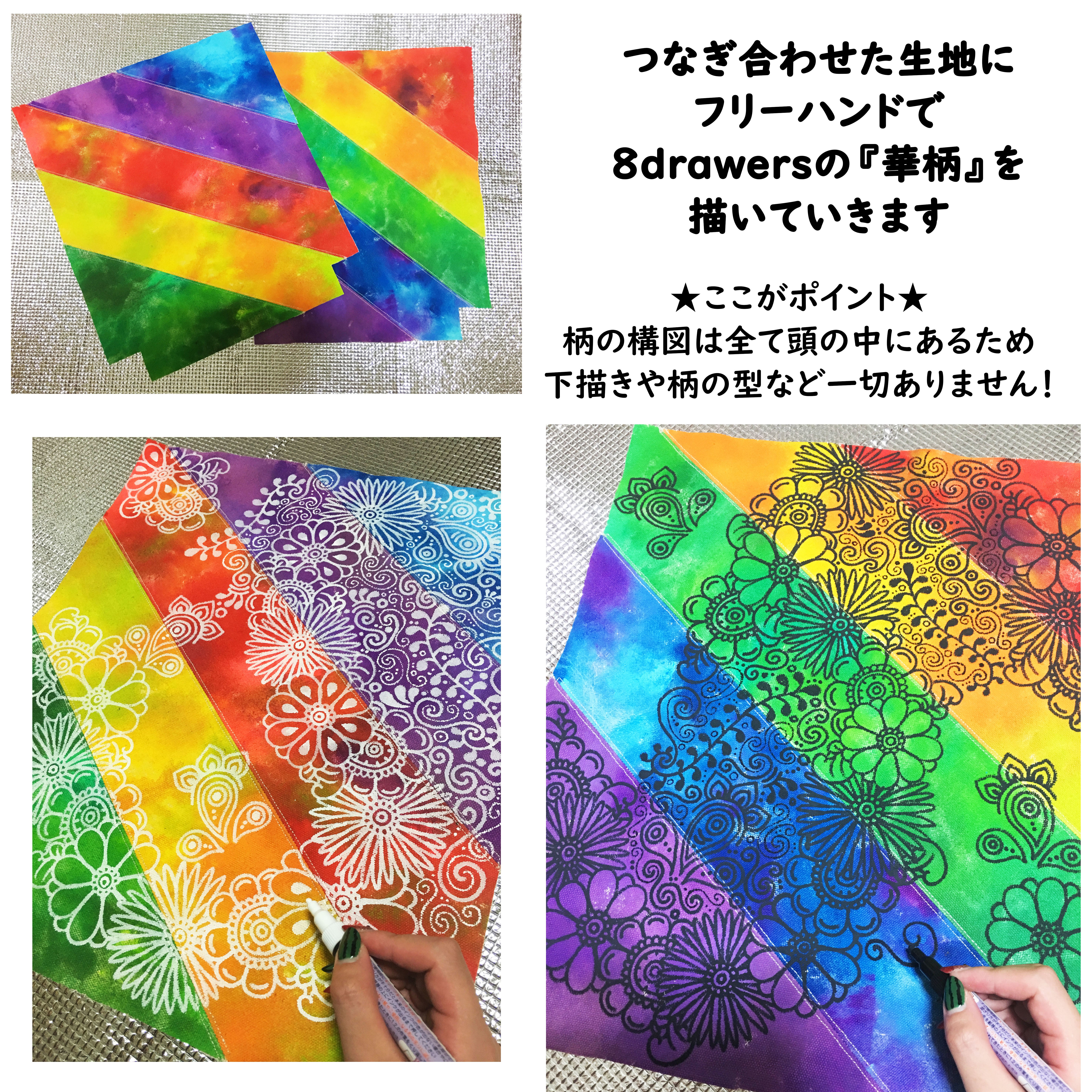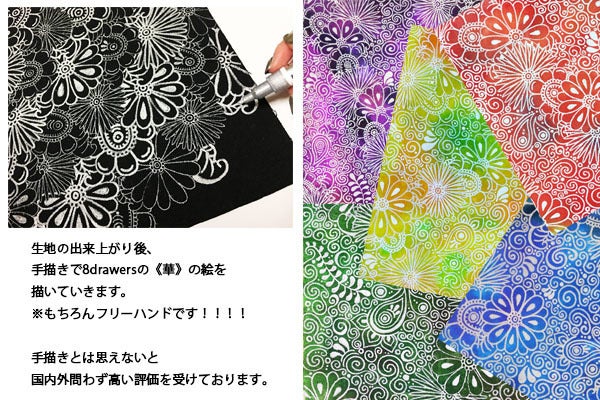 世界にたった一つの商品を手掛けております。 生地の染色には二日間かけて色付けしており、様々な色を4~5回繰り返して染色することで美しく、深みのある色合いの生地に仕上がります。 そして、8drawers商品の絵は一つ一つ手描きです。生地に直接手描きをすることで生地に立体感が生まれ、まるでだまし絵のようなアートを感じることができます。 同じ生地、同じ柄が二度と出来上がりませんので、本当の意味で世界にただ一つの商品です。
