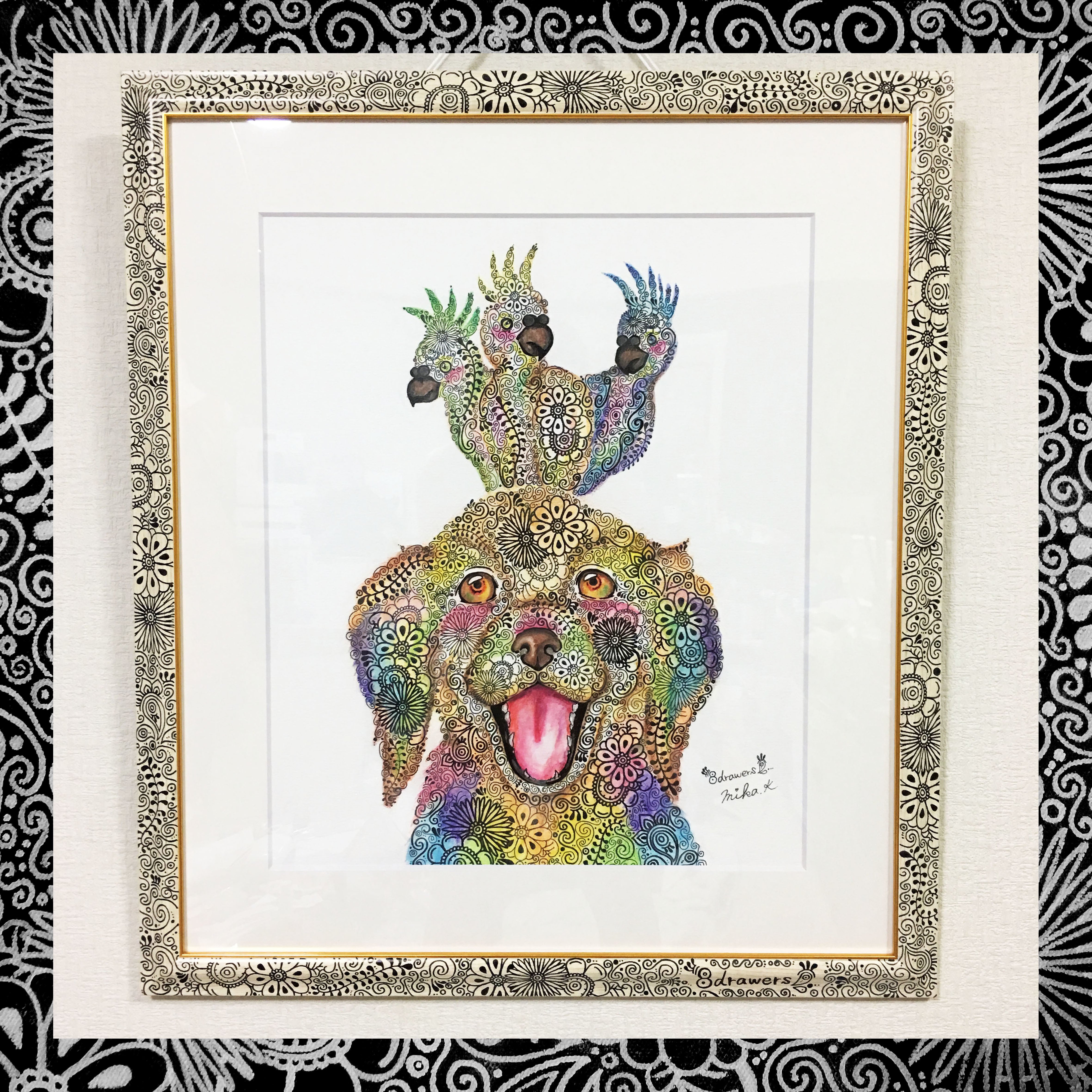 一番8drawersで人気のあり、そして海外のアーティストの方々からも称賛を頂いているカラフルで幸せ溢れるアニマルに8drawersの『華柄』をプラスさせたアート作品です。