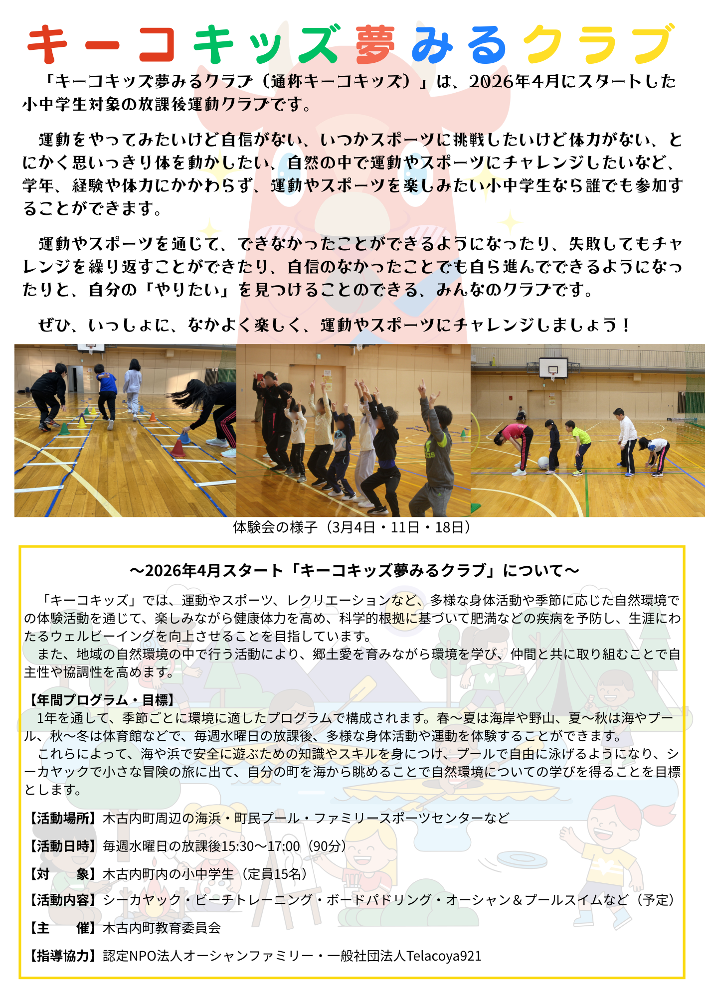放課後地域クラブ「キーコキッズ夢みるクラブ(通称キーコキッズ)」(主催:木古内町教育委員会)は、子どもたちが誰でも、運動やスポーツ、レクリエーションなど多様な身体活動や自然環境での体験を通じて、楽しみながら健康体力を高め、科学的根拠に基づいて肥満などの疾病を予防し、生涯にわたるウェルビーイングを向上させる目的で、今年4月15日、木古内町において創設されます。
