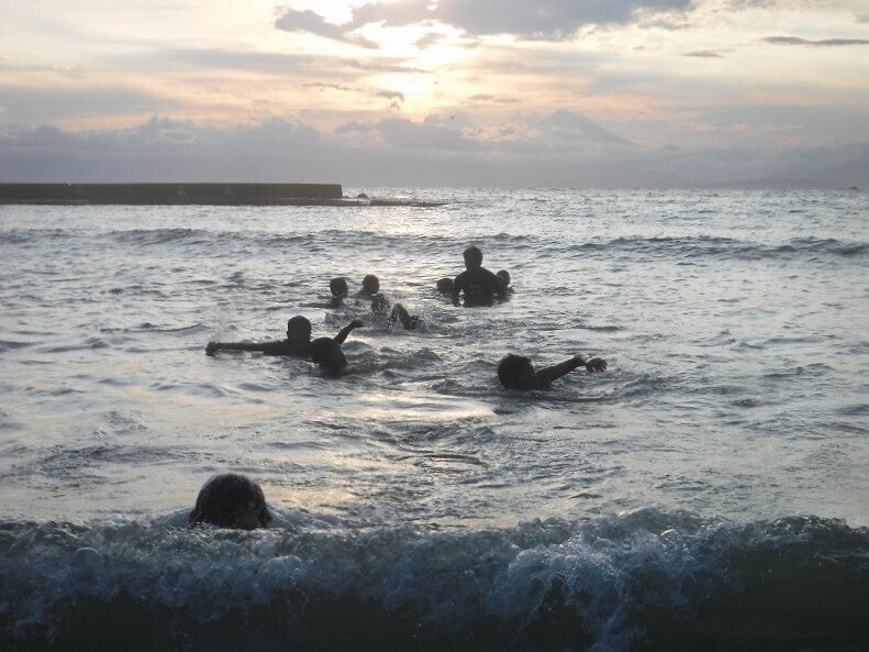木古内町の地域課題として、「子どもたちの運動環境づくり」が挙げられます。少子化は、多くの市町村が抱える問題でこの町も同じです。子どもたちの身体活動機会の減少は、この少子化によって加速していると言えます。夕暮れの海は子どもたちのお気に入りの場所(神奈川県葉山町)