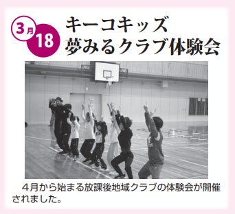 2026/04/03 12:02広報きこない4月号に「キーコキッズ」体験会(3月18日)の様子が掲載されました。準備運動に、みんなで「キーコ体操」を行っているひとコマです。 もっと見る