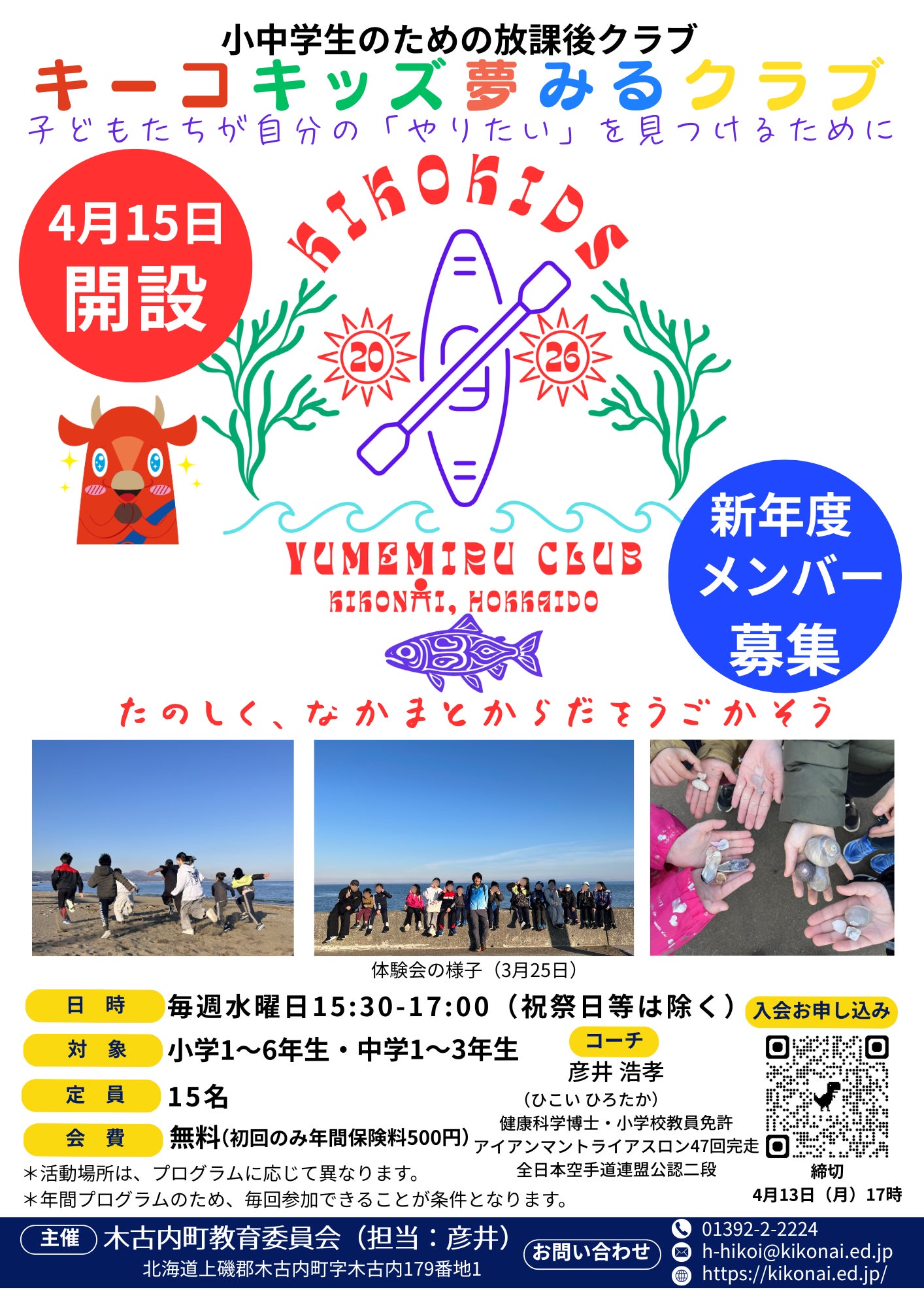 放課後地域クラブ「キーコキッズ夢みるクラブ(通称キーコキッズ)」(主催:木古内町教育委員会)は、子どもたちが誰でも、運動やスポーツ、レクリエーションなど多様な身体活動や自然環境での体験を通じて、楽しみながら健康体力を高め、科学的根拠に基づいて肥満などの疾病を予防し、生涯にわたるウェルビーイングを向上させる目的で、今年4月15日、木古内町において創設されます。