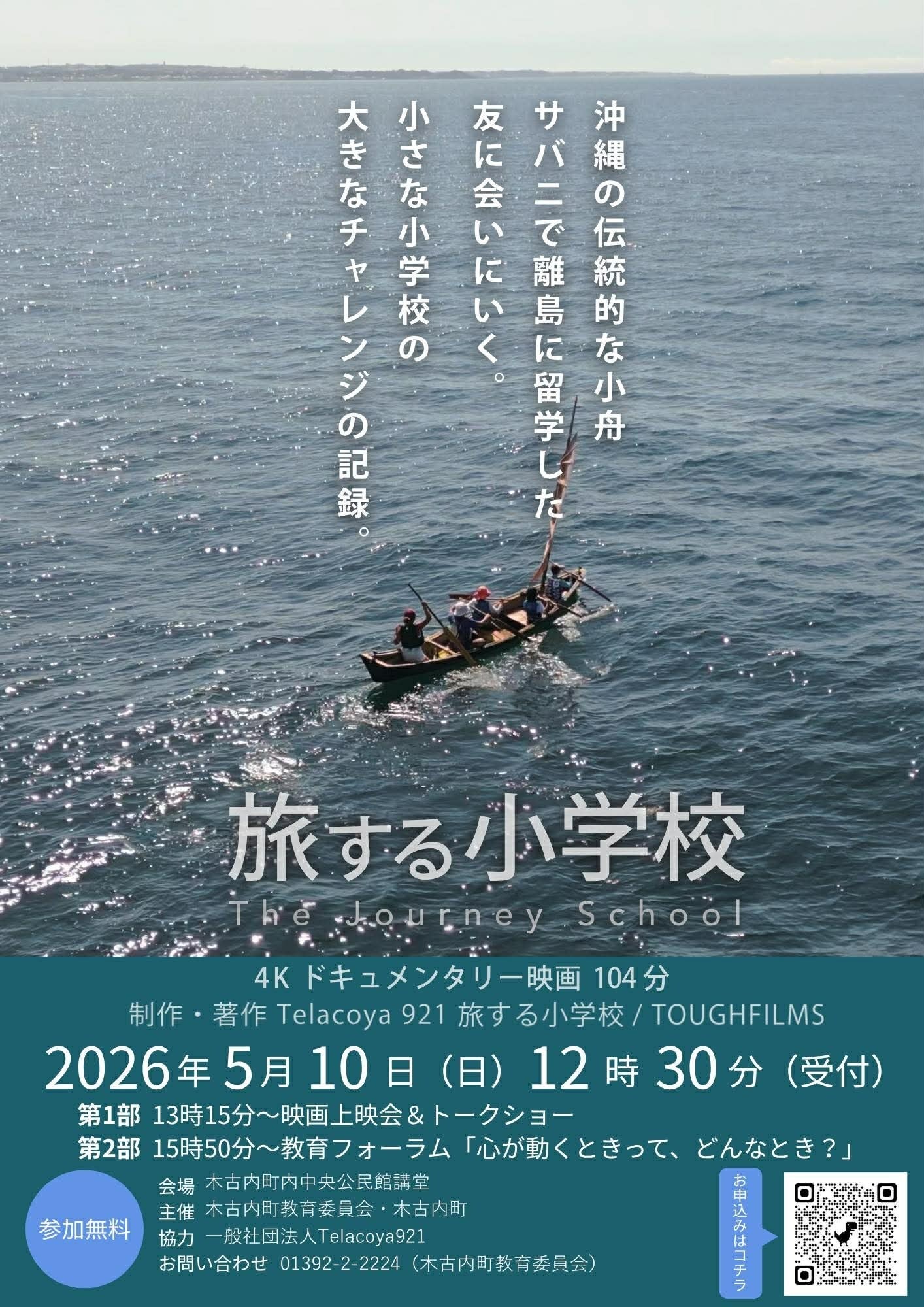 2026/04/08 17:035月10日(日)午後、「キーコキッズ夢みるクラブ」をご支援いただいている一般社団法人Telacoya921代表の中尾薫さん、海洋ジャーナリストの内田正洋さんも出演されているドキュメンタリー映画「旅する小学校-The Journey School」の上映会が開催されます。ご関心のある方は、ぜひご参加ください。参加は無料です。・日時 2026年5月10日(日) 13時00分~開会式 13時15分-15時30分 第1部:映画上映会&トークショー 15時50分-16時50分 第2部:教育フォーラム「心が動くときって、どんなとき?」*第2部は、「旅する小学校」代表の中尾薫さん他、地域の教育機関などから有識者をお呼びしてパネルディスカッションを行います。・場所 木古内町中央公民館講堂・対象 児童生徒、保護者、地域住民、学校関係者、教育関係者他・参加無料・主催 木古内町教育委員会参加お申し込みはこちらから。 もっと見る
