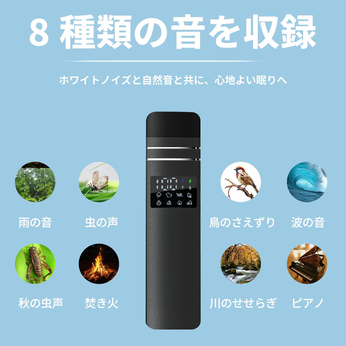A: はい、可能です。Bluetooth 5.3によるスマホ接続はもちろん、最大32GBのmicroSDカードに対応しているため、本体のみで音楽を再生できます。また、8種類の自然音(ホワイトノイズ)も内蔵されており、スマホの通知に邪魔されたくない「デジタルデトックス」な夜にも最適です。