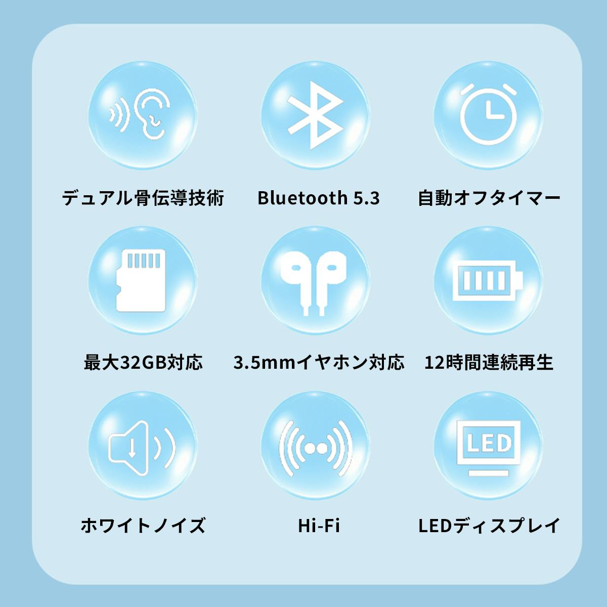 ただ枕元で音が鳴るだけではありません。臨場感を生むデュアル骨伝導システム、途切れにくいBluetooth 5.3、一晩中使えるスタミナ、そして便利なタイマーやメモリ機能まで。快適な睡眠導入に必要なあらゆる要素を、このスリムで上質なボディに凝縮しました。