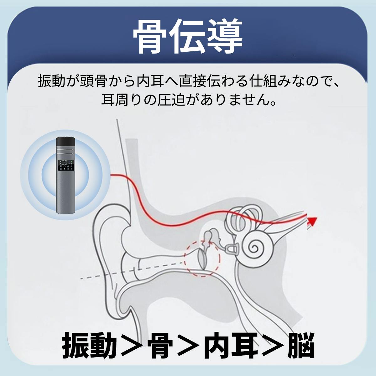 振動が頭骨を通じて内耳へ直接伝わる仕組みを採用。鼓膜への負担を軽減し、周囲への音漏れを最小限に抑えながら、クリアな音質を実現しました。耳周りの圧迫感が全くない、新しい聴き方をご提案します。