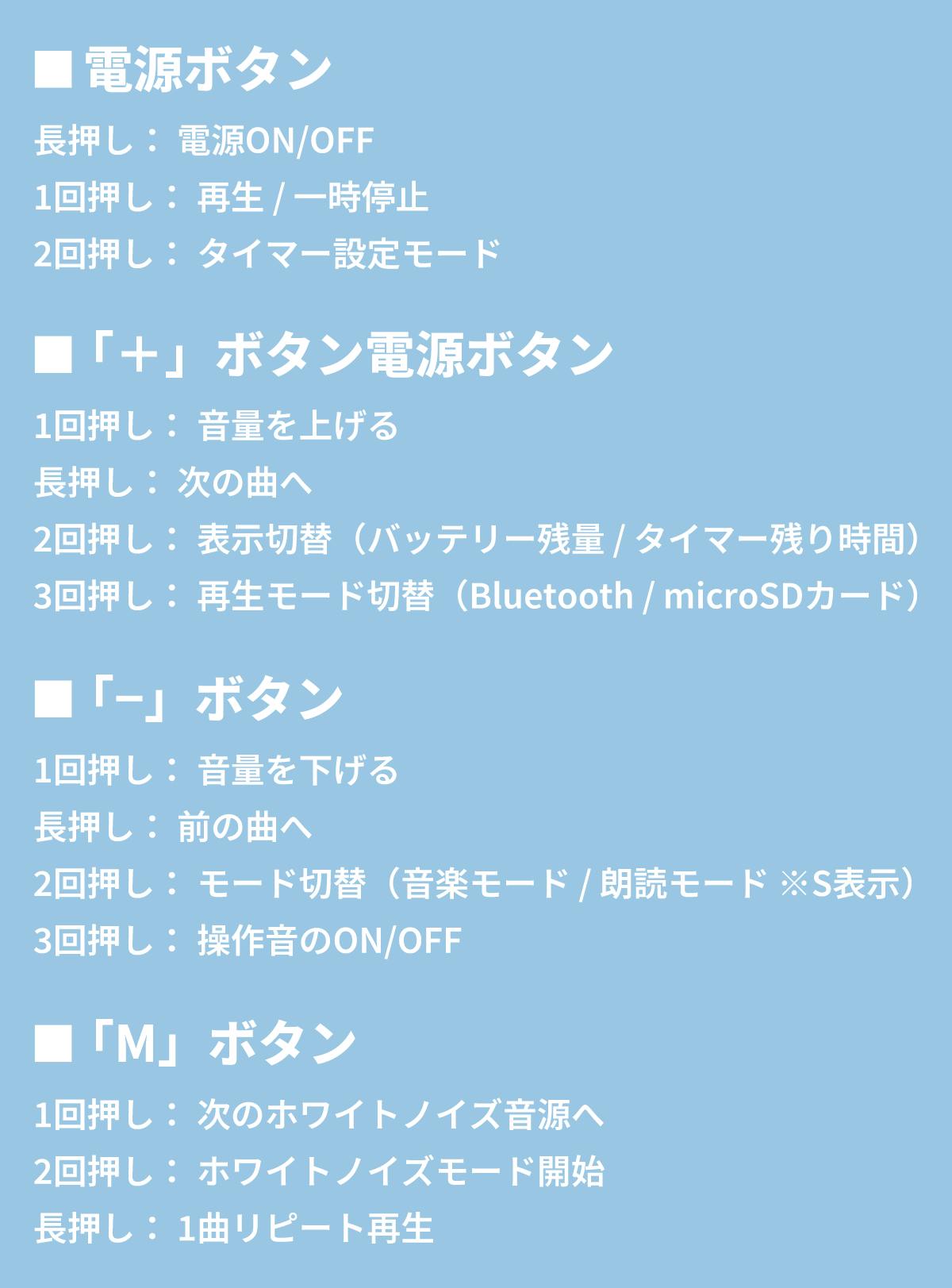 A: コンパクトなボディながら大容量バッテリーを搭載しており、最大約12時間の連続再生が可能です。また、5分単位(最大195分)で設定できる自動オフタイマー機能を併用すれば、バッテリーの消費を抑えつつ、朝までぐっすりとお休みいただけます。