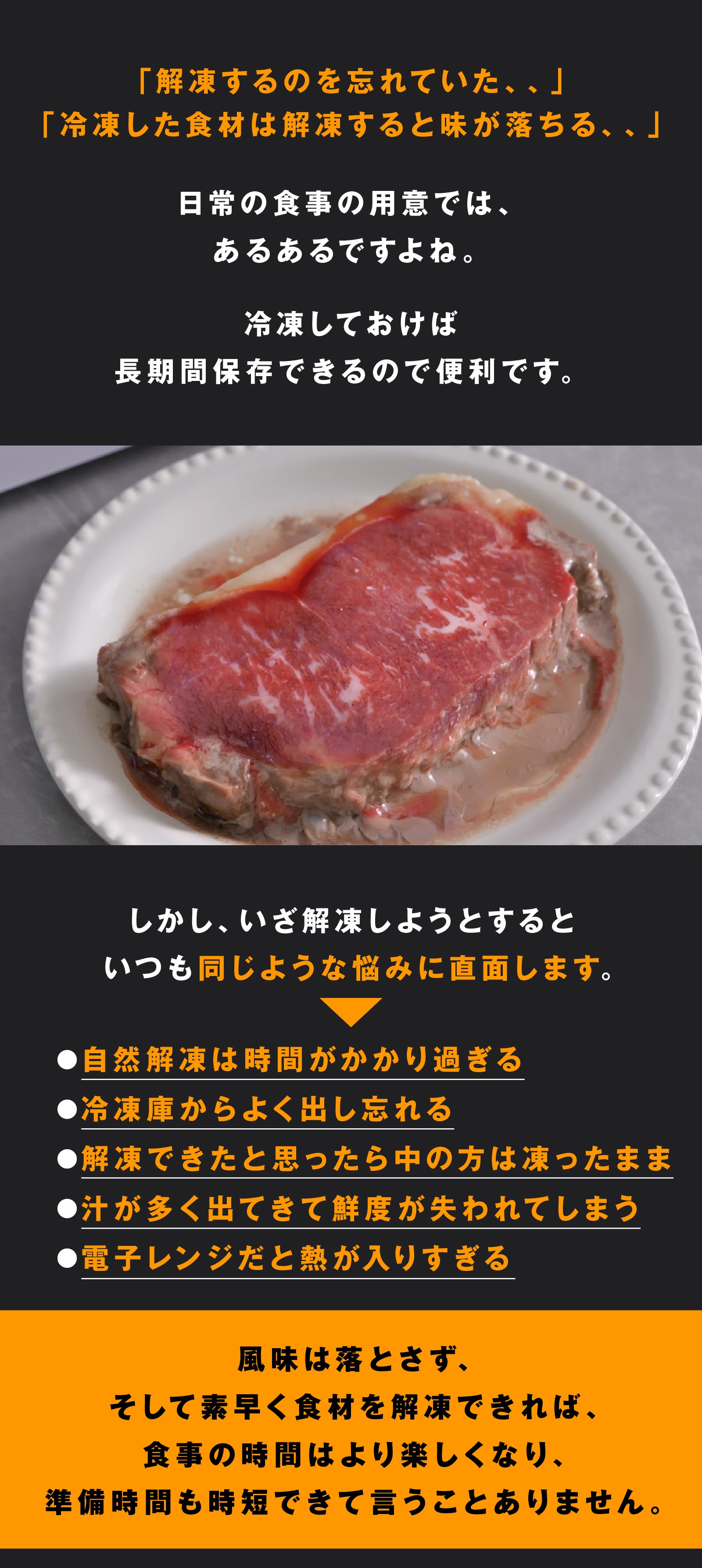 解凍時間を圧倒的に縮め、従来の解凍方法での悩みをまるごと解消。