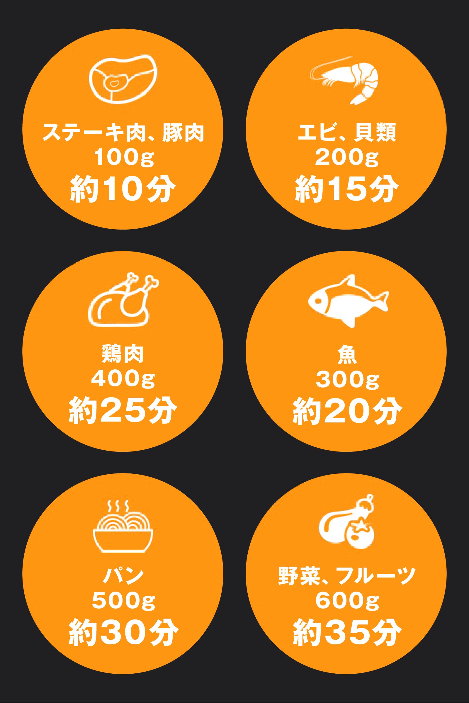 ステーキ肉や大きな肉のブロック、魚やカニ、野菜などあらゆる冷凍食材に対応。