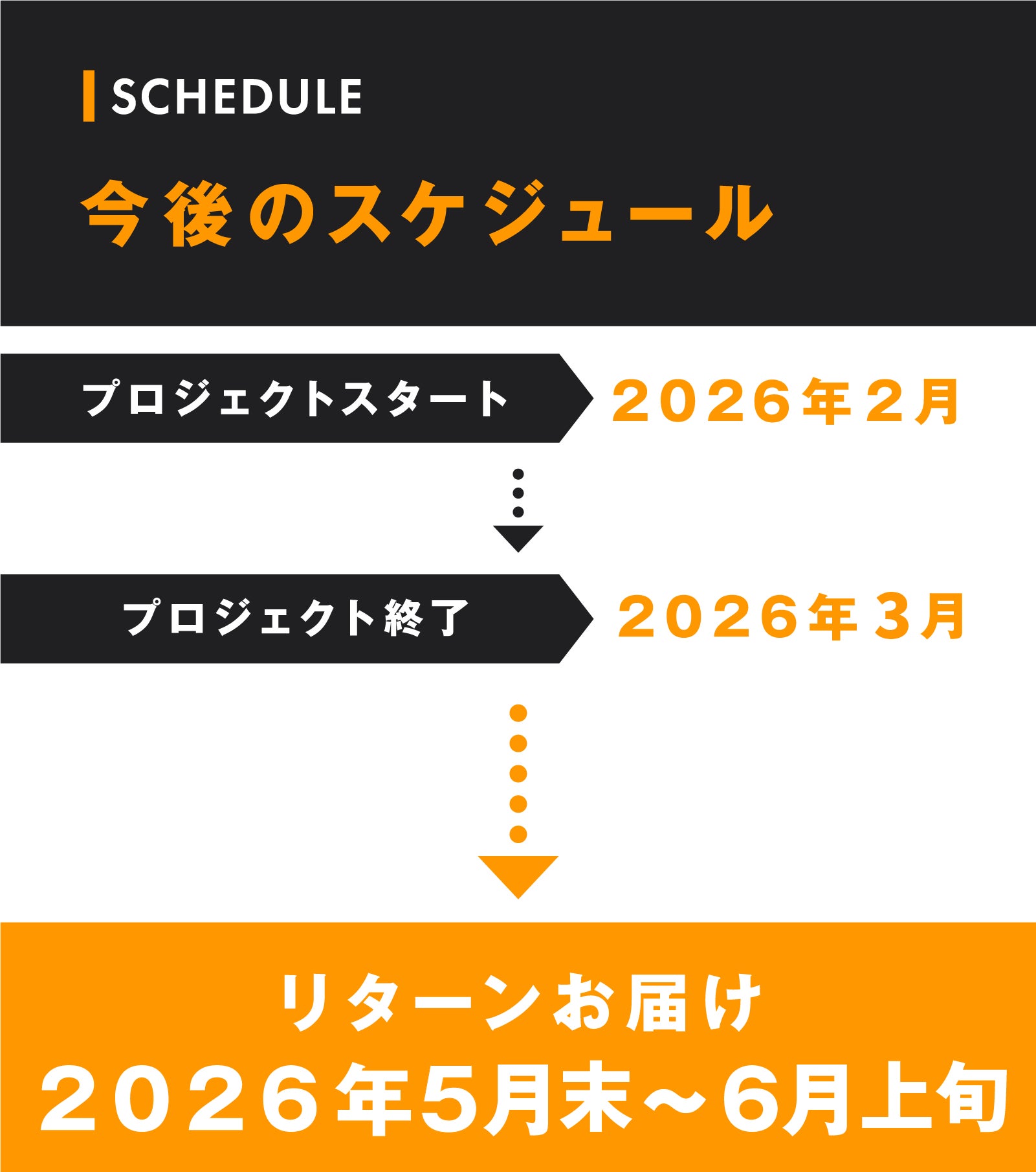 ※本文中に記載させていただいたスケジュールは、あくまでプロジェクト公開時点の予定です。クラウドファンディングの性質上、配送遅延のおそれがございます。以上の注意点につきましてあらかじめご理解とご了承いただいた上でご支援くださいますよう、よろしくお願い申し上げます。