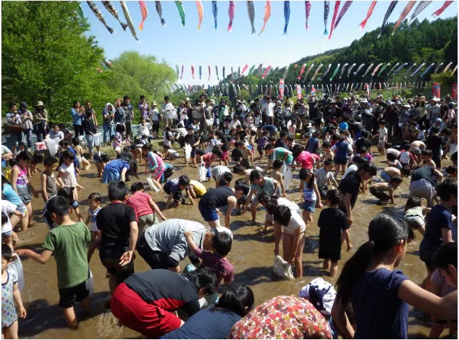 「すべての子どもたちの無病息災を願って・大空に僕らの夢をのせて」をスローガンに、毎年5月5日のこどもの日に棚田を利用した「泥んこカヌーレース」、「鯉のつかみ取り」等から構成されるお祭りを開催してきました。(2020~2022年はコロナ影響によりお祭りは開催できませんでしたが、実行委員の強い想いもあり鯉のぼりは様々な願いを込めて空高く舞い上がりました)