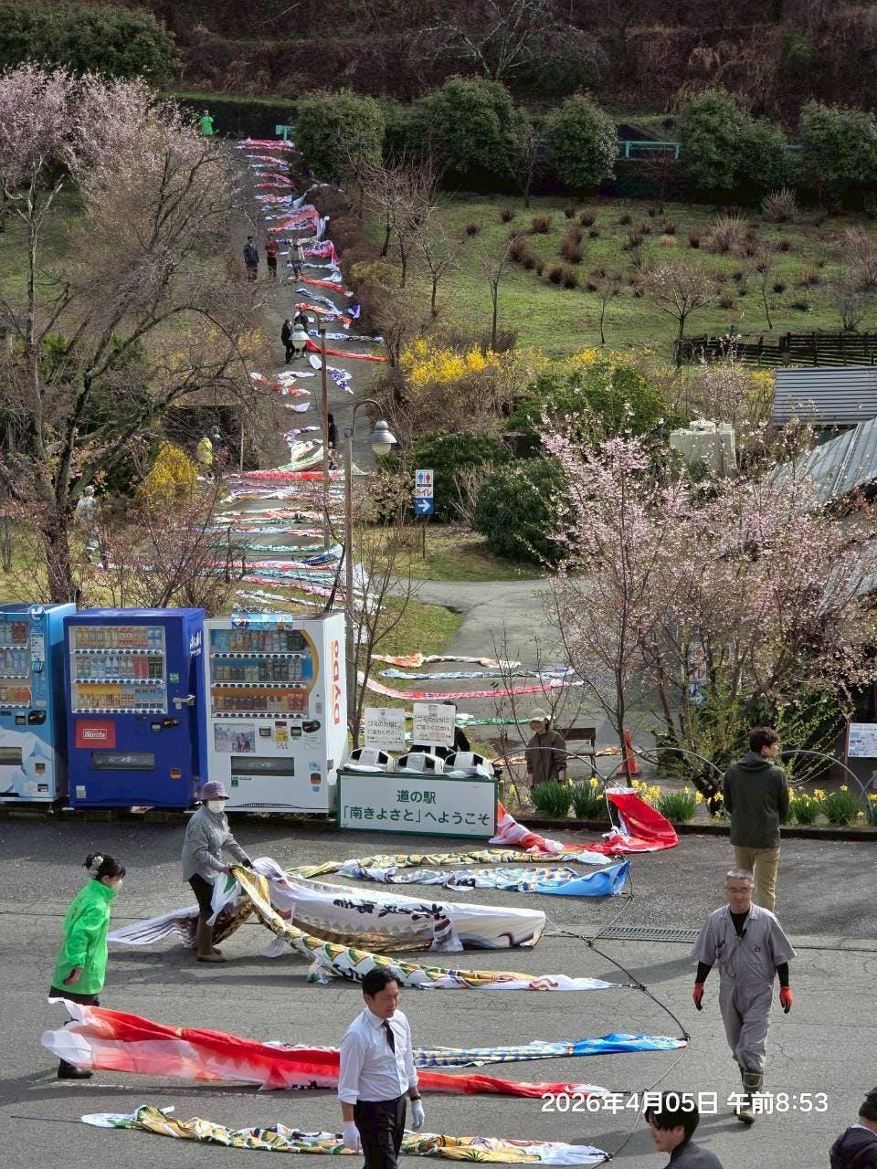 本日、鯉のぼりの設置作業を行い、先ほど終了しました。