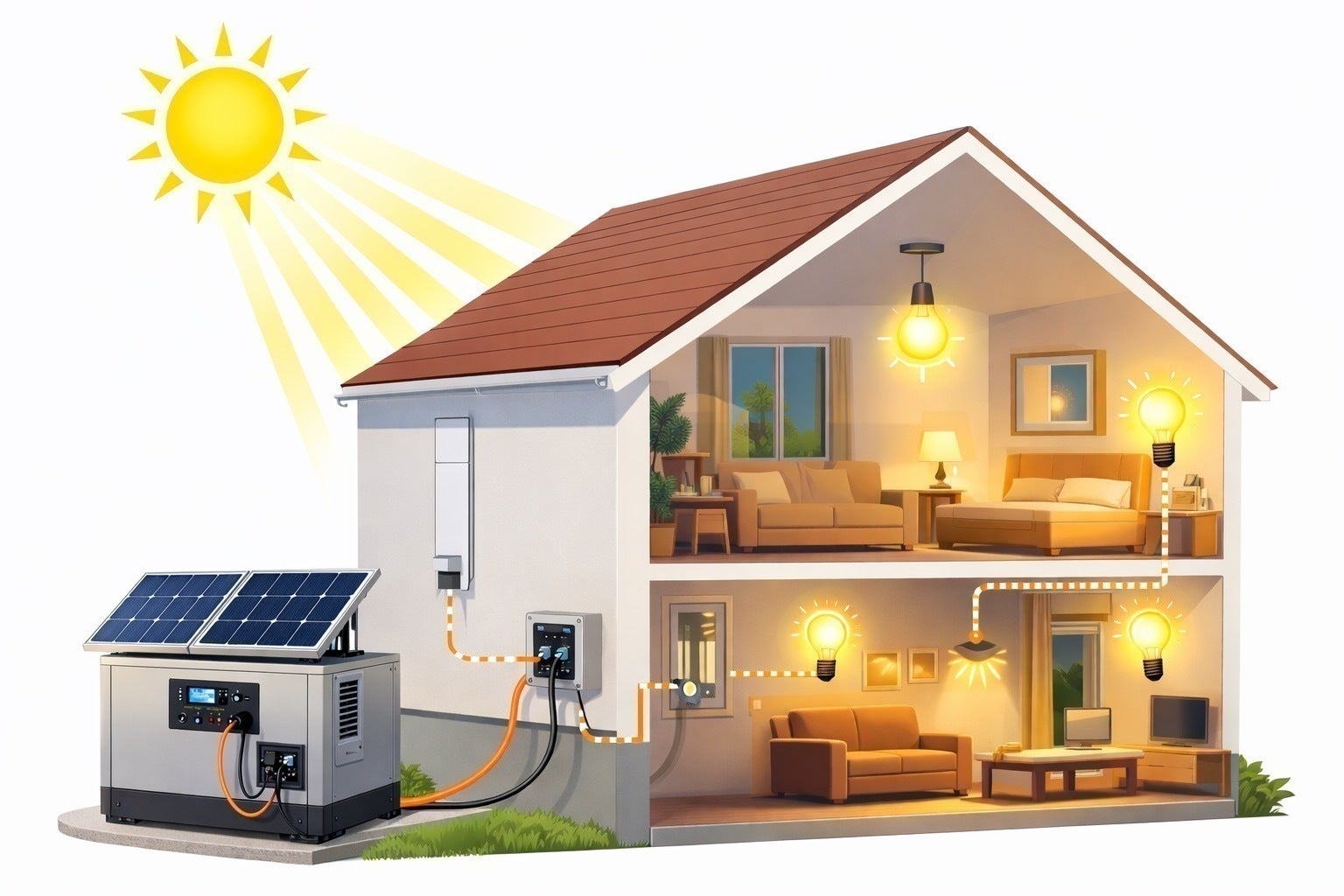 日中の太陽光で電気をため、夜は家の照明として使えること、