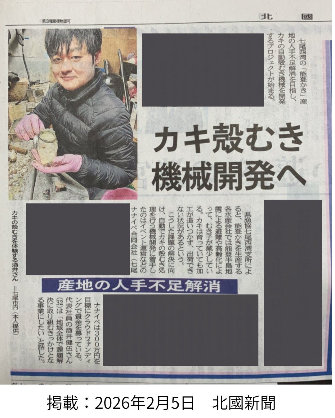 今回はありがたいことに、私たちの取り組みが北國新聞社さんに取材いただき、2/4夕刊と2/5の朝刊に掲載いただきました!ご掲載いただいた中では、今の能登が抱える人手不足の現状から牡蠣剥き機械の開発の必要性、またクラウドファンディングの取り組みまで幅広く取材いただきました。皆さまからの温かいご支援もあり、少しずつですが、開発に着手できるように準備を進めております!引き続きクラウドファンディング含めご支援を賜れますと幸いです!よろしくお願い申し上げます。#能登 #能登かき #牡蠣好き #牡蠣グルメ #海の幸#能登復興 #がんばろう能登 #北陸応援 #地方創生#クラウドファンディング #クラファン挑戦中#能登屋台村