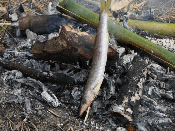 こちらの、超ワイルドな焼き方をしている魚は、あの村のすぐ近くの鋸南町で取れた地元の"かます"!