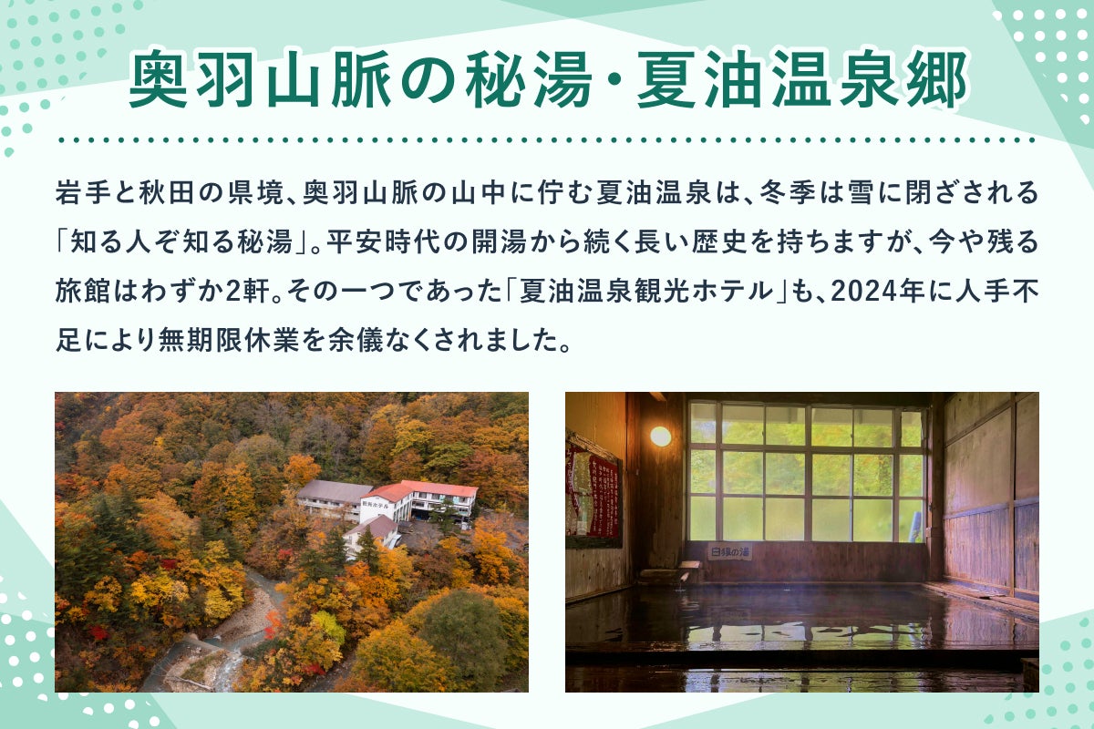 2026/04/15 13:00いよいよ本日4月15日。岩手県北上市の秘湯・夏油温泉観光ホテルの復活と新しい湯治づくりに向けたクラウドファンディングが始まりました!1年半休業していた山奥の温泉を、なぜ私たちが本気で再興したいと思ったのか。その原点をまとめたドキュメンタリー映像の第1弾を公開します。きっかけは、現場のフィールドワークで体感した3つのリアルでした。・「新太郎の湯」で感じた圧倒的な野趣と空気感・肌の弱さに悩んでいたメンバー自身が実感した、驚くべき「お湯の力」・知れば知るほど面白い、1000年続く「夏油温泉」歴史の奥深さ理屈抜きに私たちが惹きつけられた夏油の空気は、ぜひ動画本編でご覧ください!本日からいよいよ、新しいプロジェクトが動き出します。動画を見て少しでも面白そうだと感じていただけたら、私たちの仲間になっていただけると嬉しいです。初日のスタートダッシュ、皆さまのご支援とシェアでの応援をよろしくお願いします! もっと見る