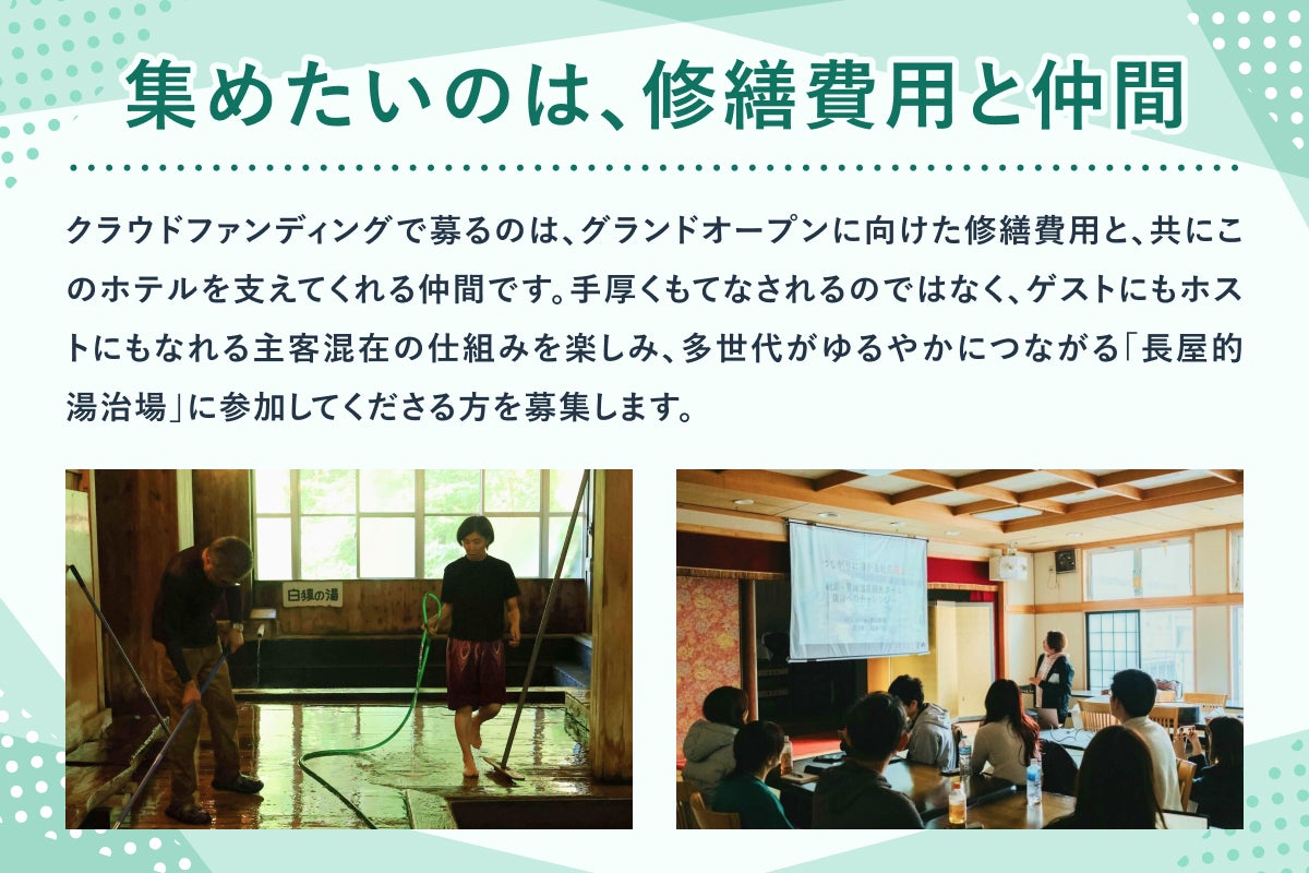 2026/04/16 13:00クラウドファンディングへの温かいご支援やシェア、本当にありがとうございます!本日は、「この夏油温泉観光ホテルを通じて、どんな未来を実現したいのか」を語るドキュメンタリー映像の第2弾を公開します。私たちが目指すのは、単なる宿泊施設の復活ではなく、現代に合わせた「新しい湯治」の創造です。動画では、実現したい未来について3つの視点からお話ししています。・人との繋がりに浸る、新しいコンセプト「社交の湯」・若い世代も楽しめる、「温泉のあるゲストハウス」のような自然な交流・地域の人口減少が進む中でも、絶対に「残すべきもの」への強い思い「同じ釜の飯を食う」ような温かい空間をどう作っていくのか。支援の輪が少しずつ広がっており、プロジェクトメンバー一同、本当に励みになっています。動画を見て私たちが描く未来に共感していただけたら、私たちの仲間になっていただけると嬉しいです。引き続き、皆さまのご支援とシェアでの応援をよろしくお願いします! もっと見る