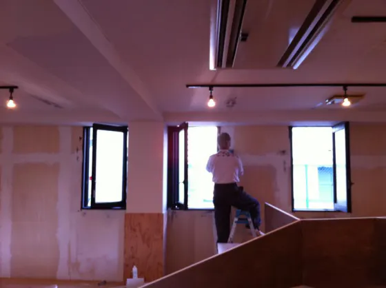 今は壁にヤスリがけをして平らにしているところです。