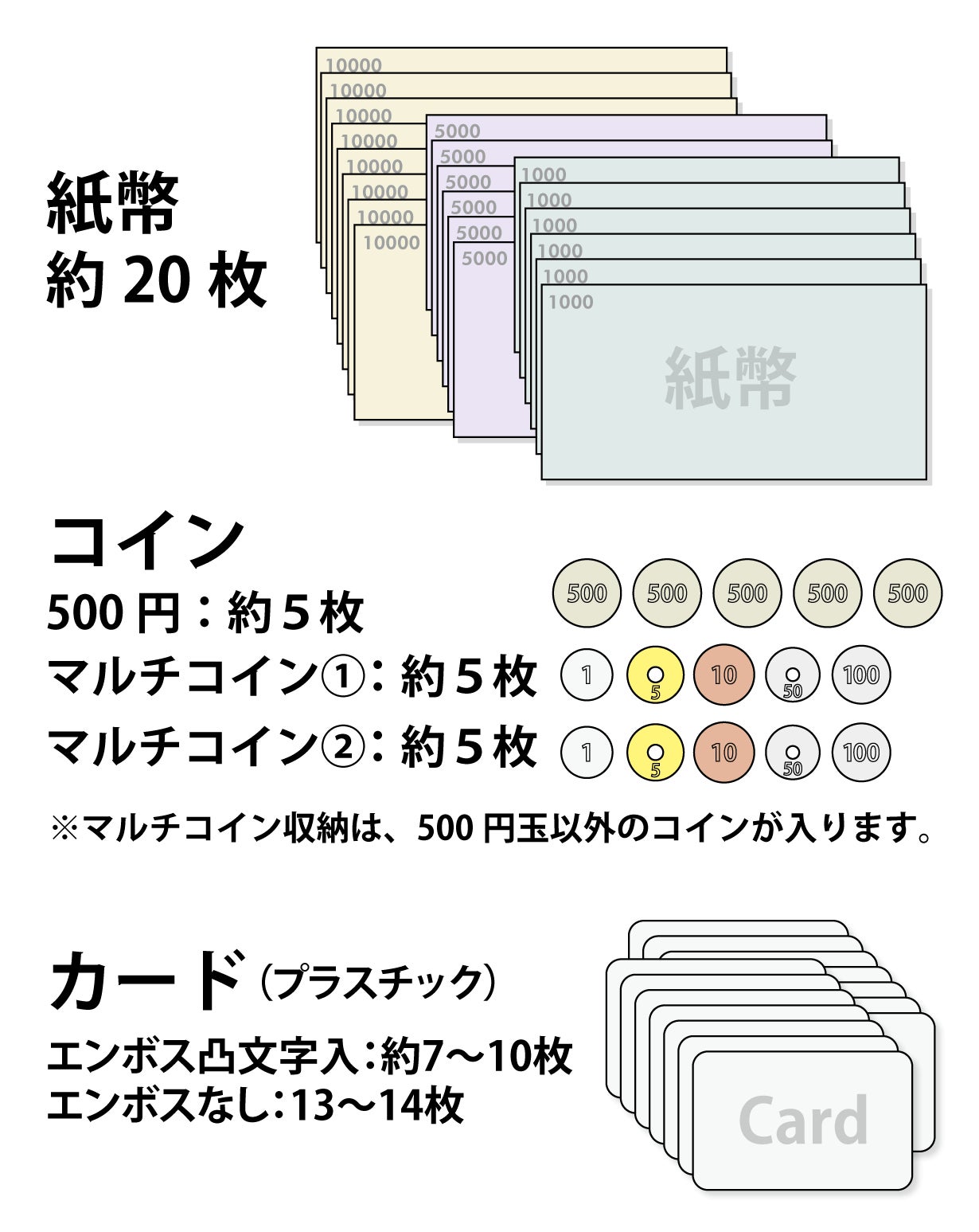 ●コイン500円:約5枚 程度マルチコインスペース:1・5・50・100円が約5枚 程度500円・10円スペースも、小さなコインの上にフタとして大きなコインを入れれば、50円・5円・1円も収納可能。※改良により、収納枚数は変更になる場合があります。※全ての寸法や重量は試作品の実寸です。改良により変更になる場合があります。