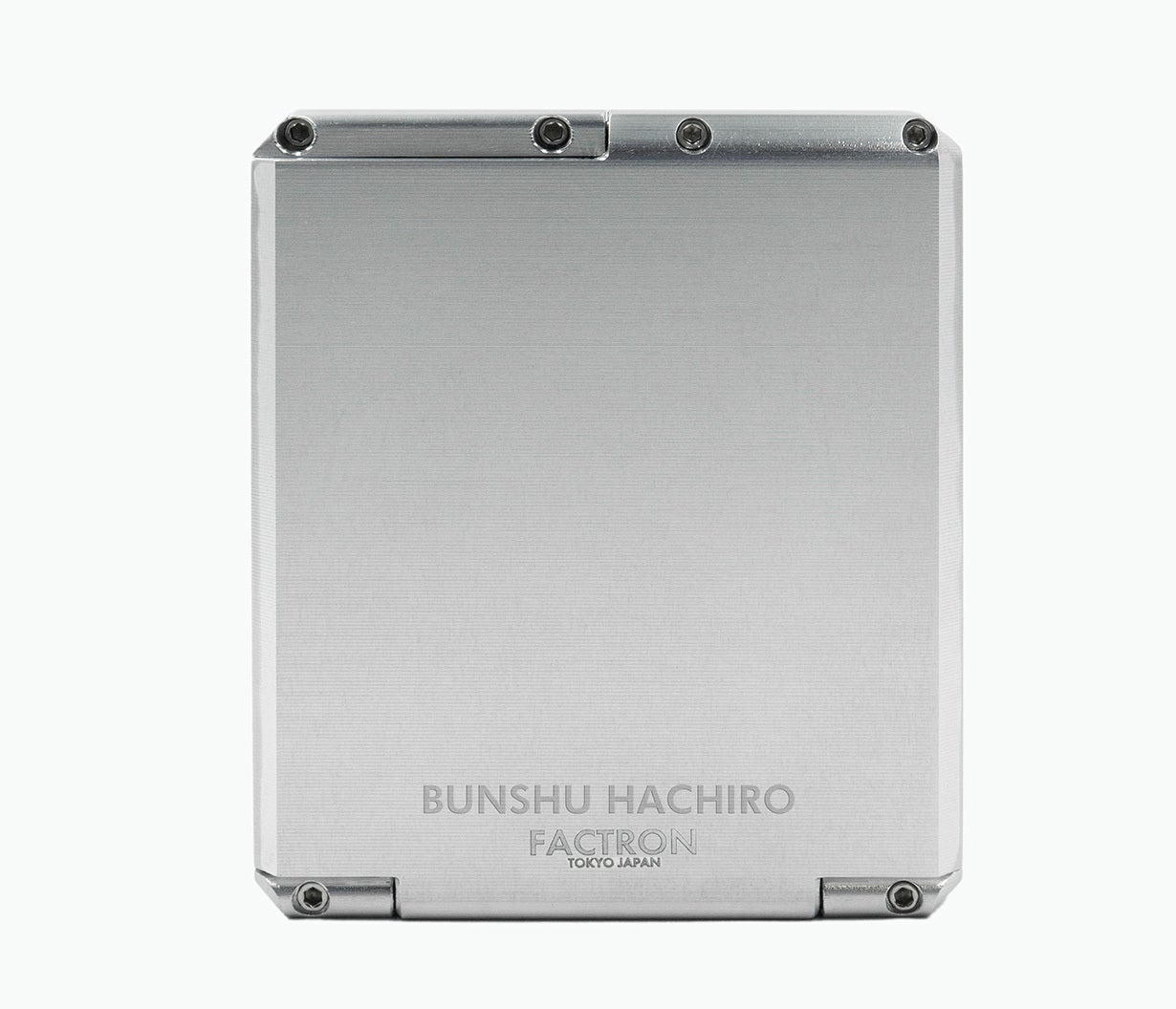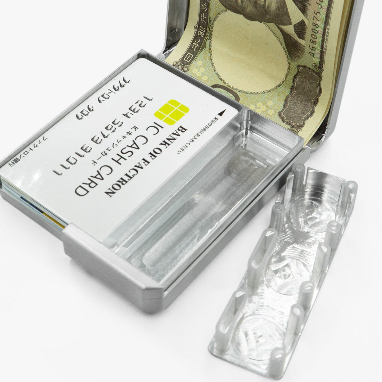 メタルウォレットBoxy2は、FACTRONが東京大田区の自社デザイン工房で、他ではあまり作る事のない3次元微細切削加工を駆使し、部品を一つ一つ無垢の材料から削り出し、ハンドメイドで仕上げます。