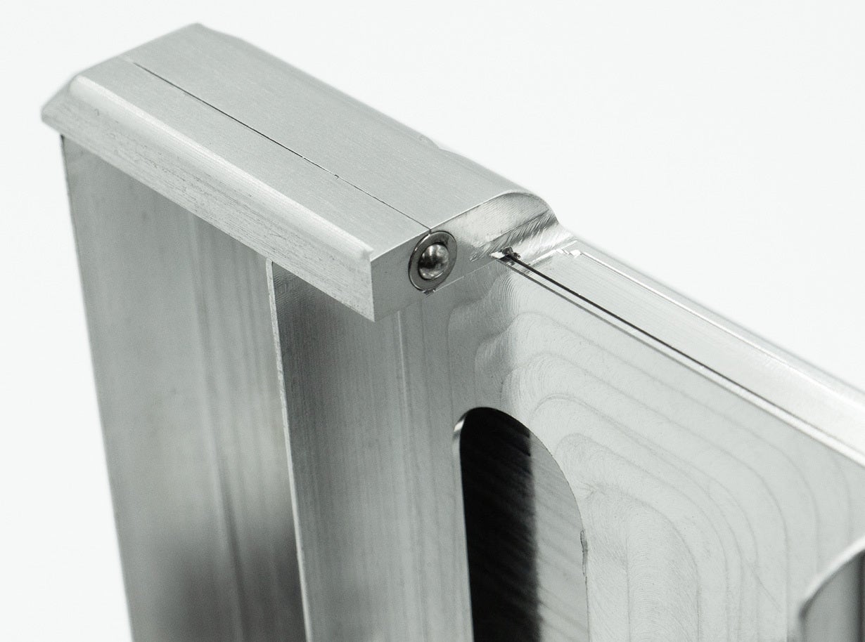 チタンモデルはジュラルミンに比べて重くなるため、今回はカード収納部分とコインホルダー(画像のカード・コイン収納の内殻部分)はジュラルミンで製造しています。これにより39gの軽量化に成功しました。
