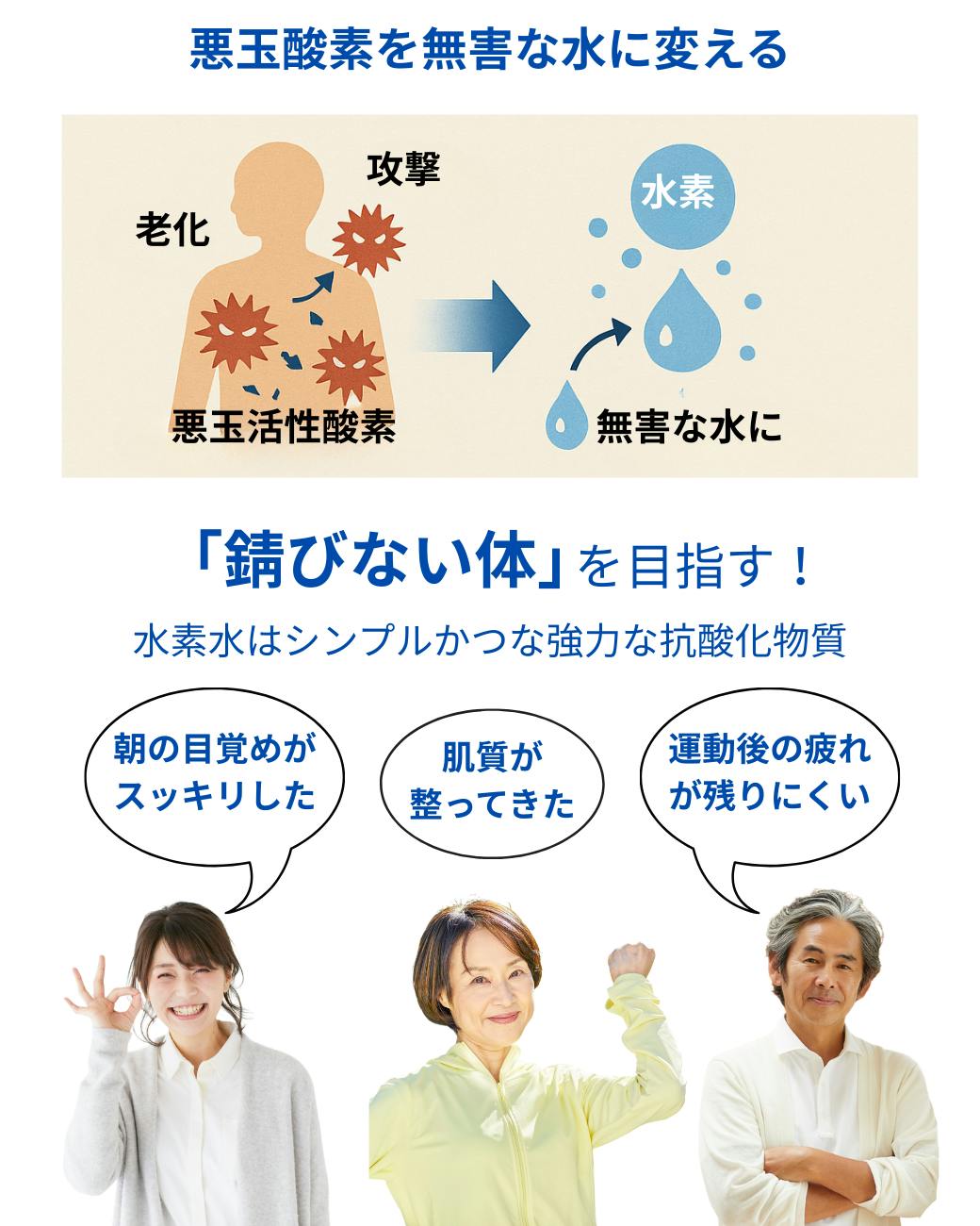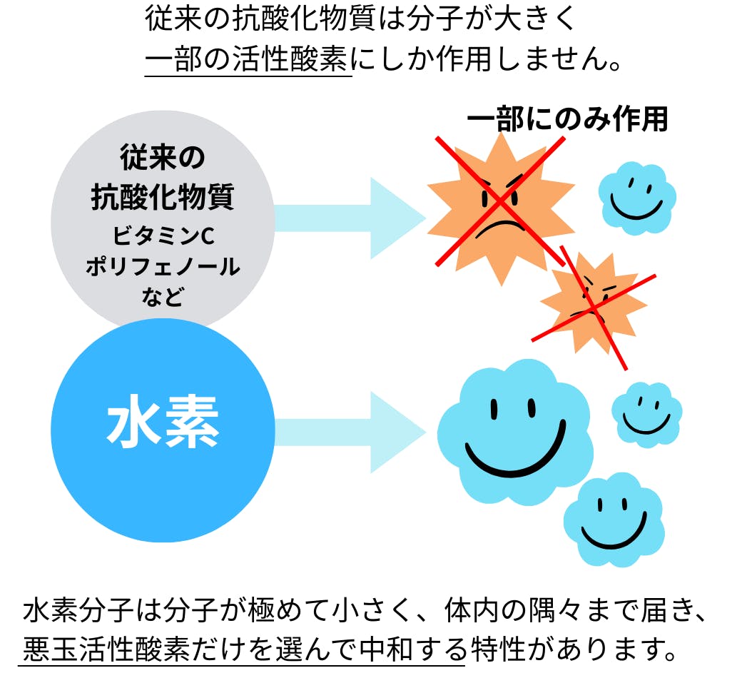 私たちの体に現れる病気の約90%は、「老化」が関係しているといわれています。老化の原因のひとつが、細胞を攻撃する悪玉活性酸素。これを無害な水に変え、体外に排出する働きを持つのが、水素です。