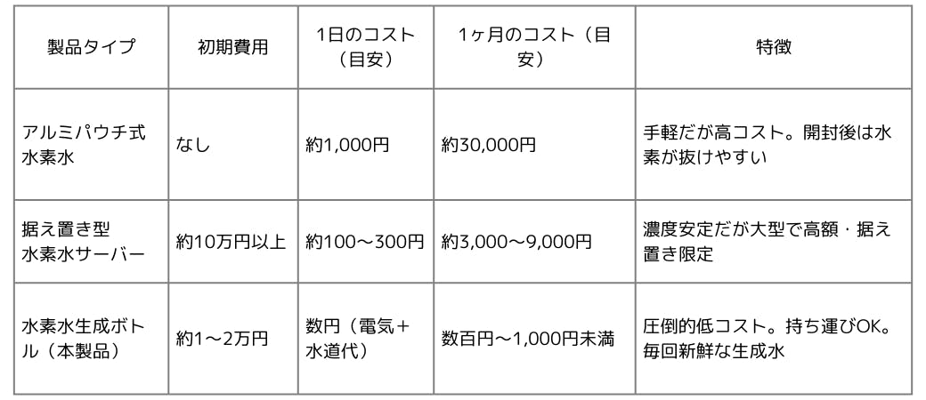 長期的に使うほど「水素水生成ボトル」は圧倒的にコスパが良く、実用的な選択肢となります。