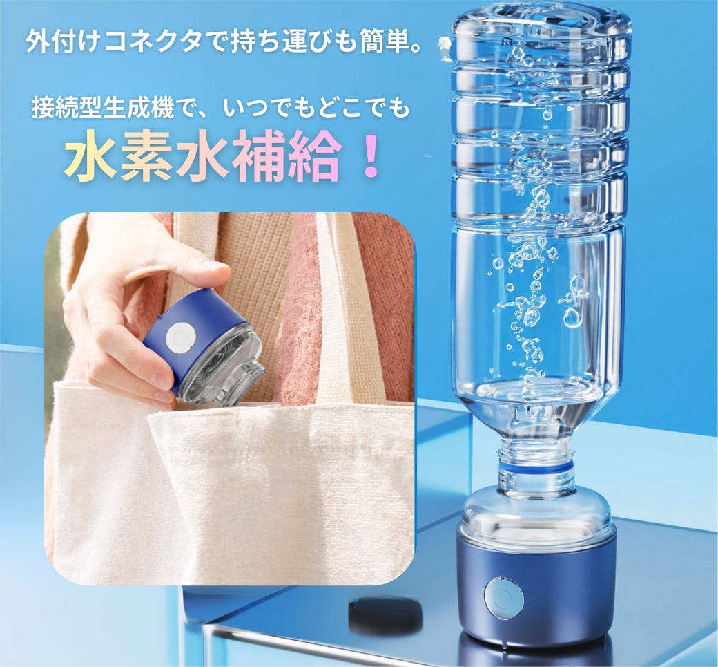 「H2 clear Air」は付属のボトルでも、ペットボトルでも使えるので、家でも外出先でも、どこでも水素水が飲めます。