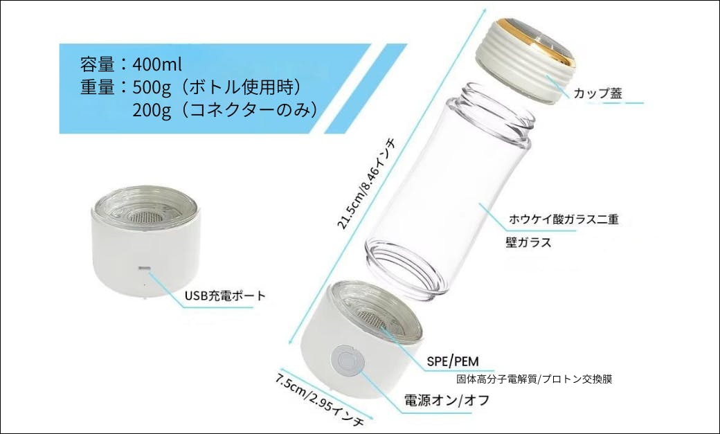 あなたは500mlをイッキに飲むでしょうか?また、500ml対応では大きくなり、持ち運びにも・・・更に少なく飲みたい場合は、水量を調整すればさらに短時間で生成できますし、多く飲む方でも400mlあれば十分!この大きさなら持ち運びにも便利で、いつでもどこでも水素水を補給できます。