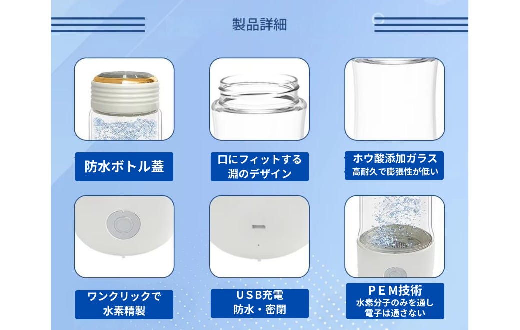 本製品は、そんな水素の力をたった3分でボトル1杯に凝縮。外出先やオフィス、自宅で、いつでも手軽に“飲む抗酸化”を始められます。日々の健康習慣に、水素水という選択を。