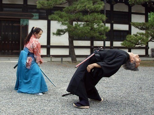 福本清三先生は、「もっとも尊敬する俳優はチャップリン」とおっしゃっていました。俳優の先輩から、斬り方は教えてもらえるけど、斬られ方は教えてもらえない。まだ若い時に斬られ方を研究なさっているときに、映画館でチャップリンを見て、その倒れ方に衝撃を受け、「ワシらはもっとやらなあかん」と演技に開眼したとのこと。チャップリンを手本として研鑽を重ねた先生は、斬られ役としての技術が評価され、また謙虚な姿勢でコツコツと一つの道を究める生き方が尊崇の念を集め、50歳を越してメディアに取り上げられるようになり、還暦の歳に『ラスト サムライ』に抜擢されるに至りました。