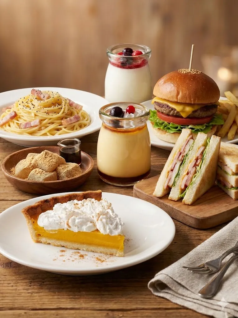 パスタやハンバーガーなどの主食からチーズケーキなどのデザート、スナック類まで幅広く用意!
