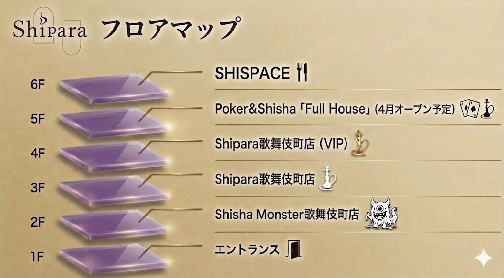 ポーカーで熱くなり、Kitchenでお腹を満たし、Shiparaで極上のシーシャと共に深くリラックスする…。 このビルだけで、一晩中遊び尽くせる「夢の動線」が完成します!!