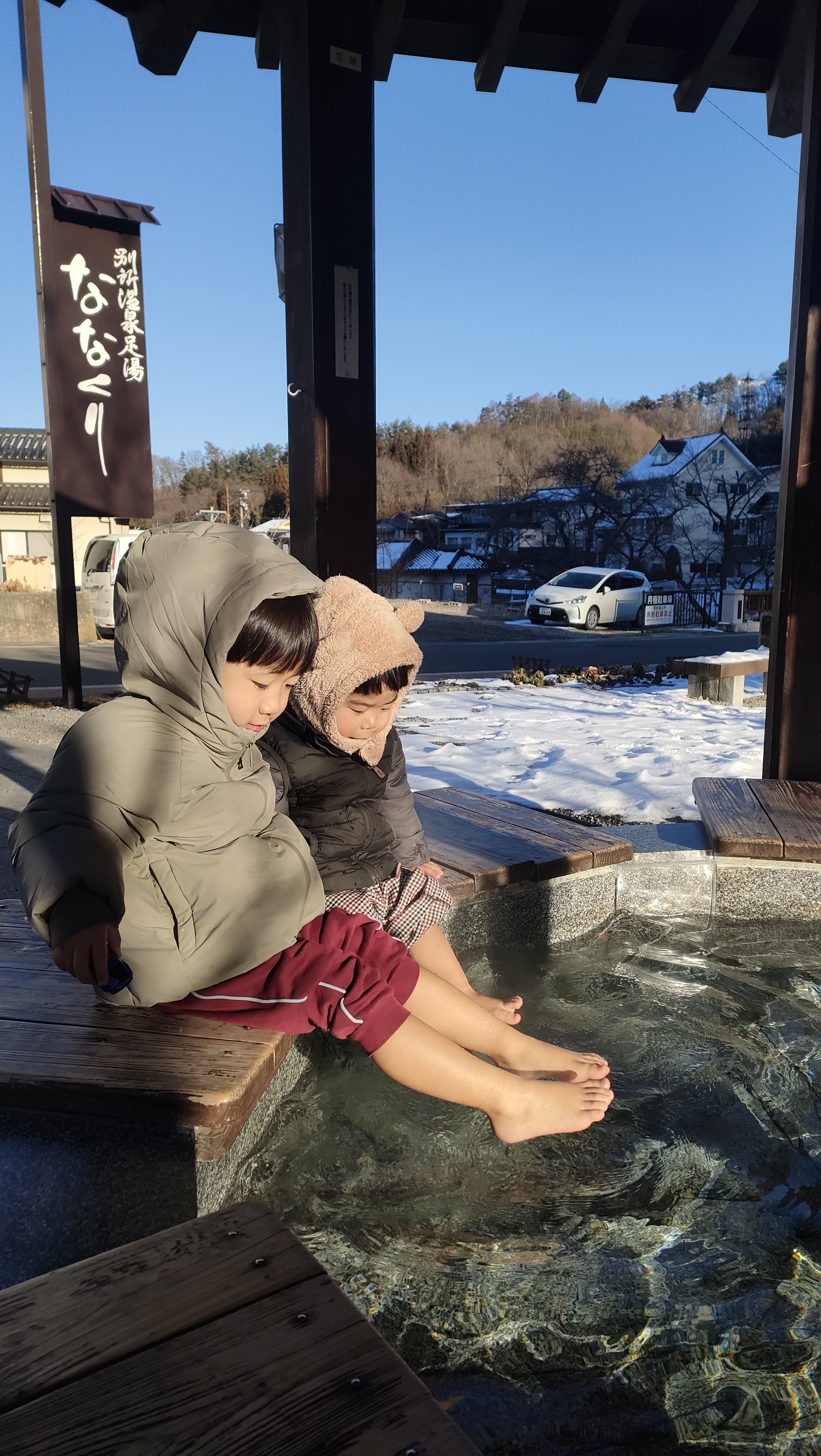 「ななくりの湯」で初めての足湯を体験する息子たち