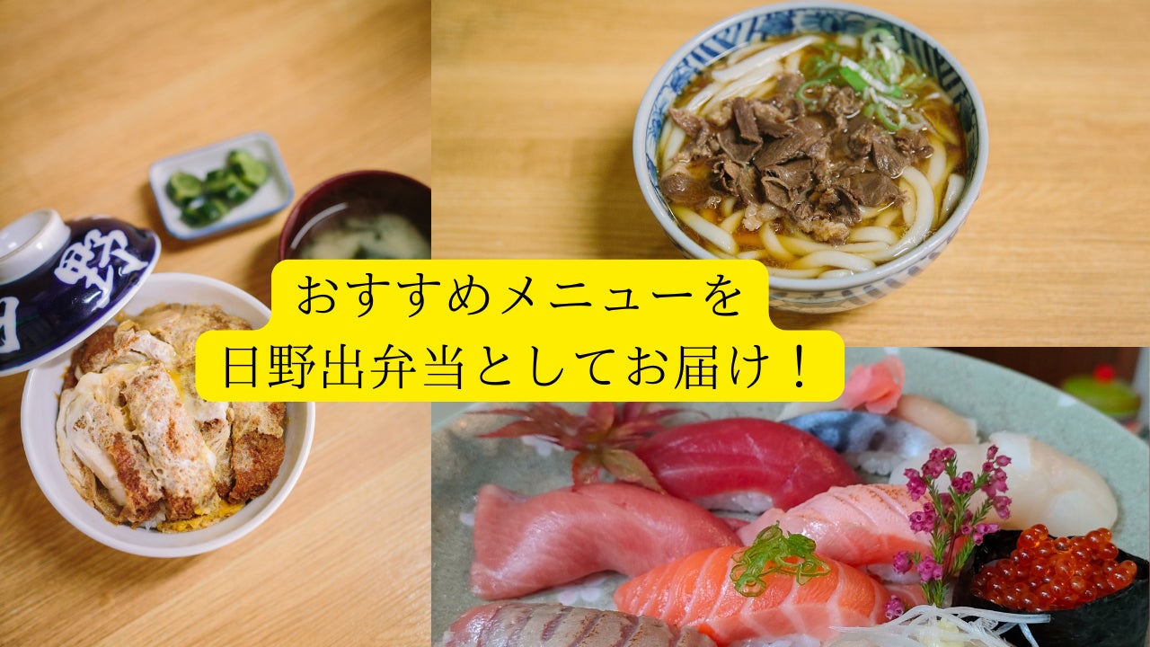 当店人気メニューの馬肉をつかった料理や、かつ丼、または新メニューの信州寿司など、選べる弁当を配送いたします。