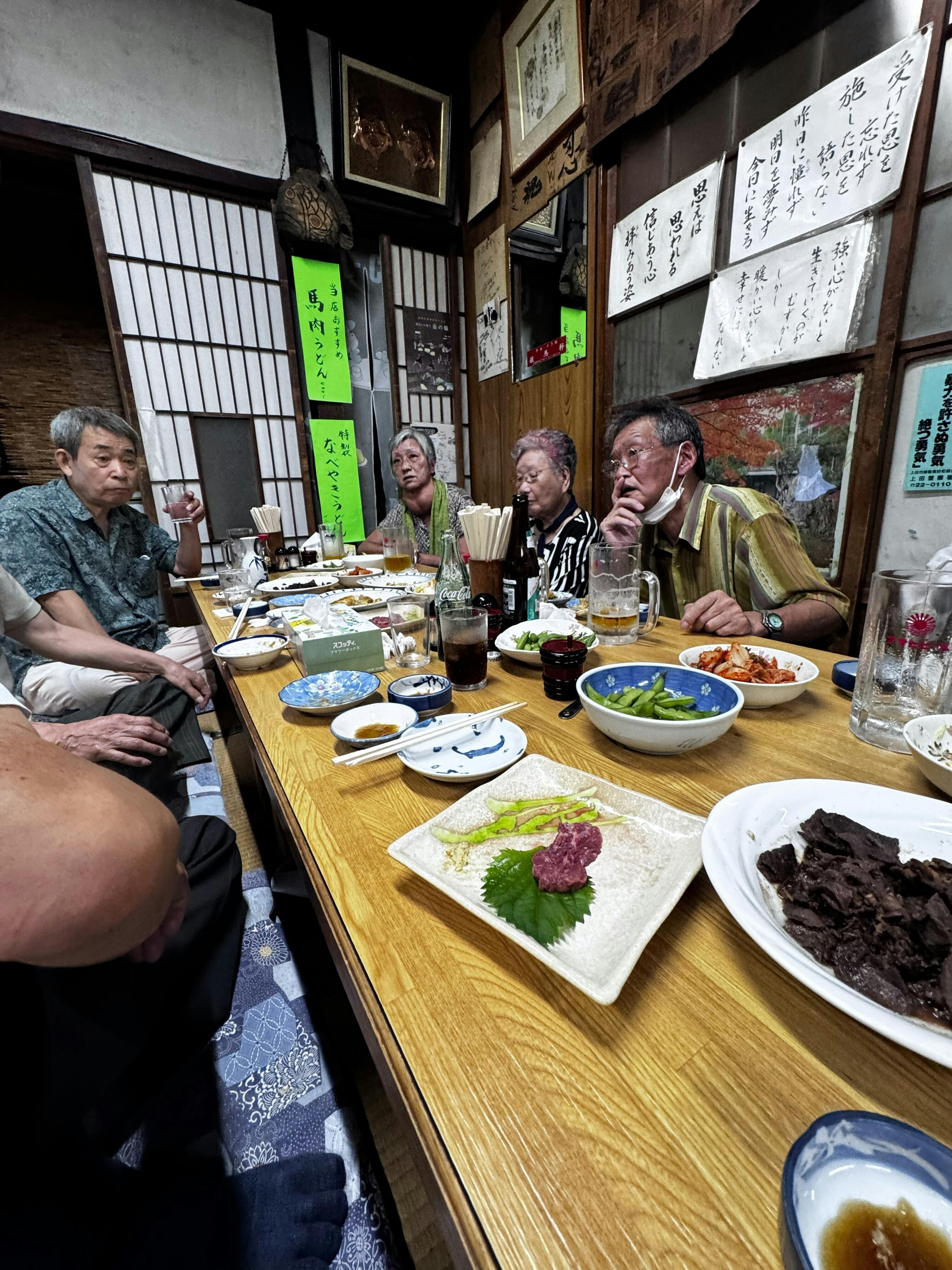 「日野出食堂」に集まり馬肉を囲みながら談笑する地元の方々