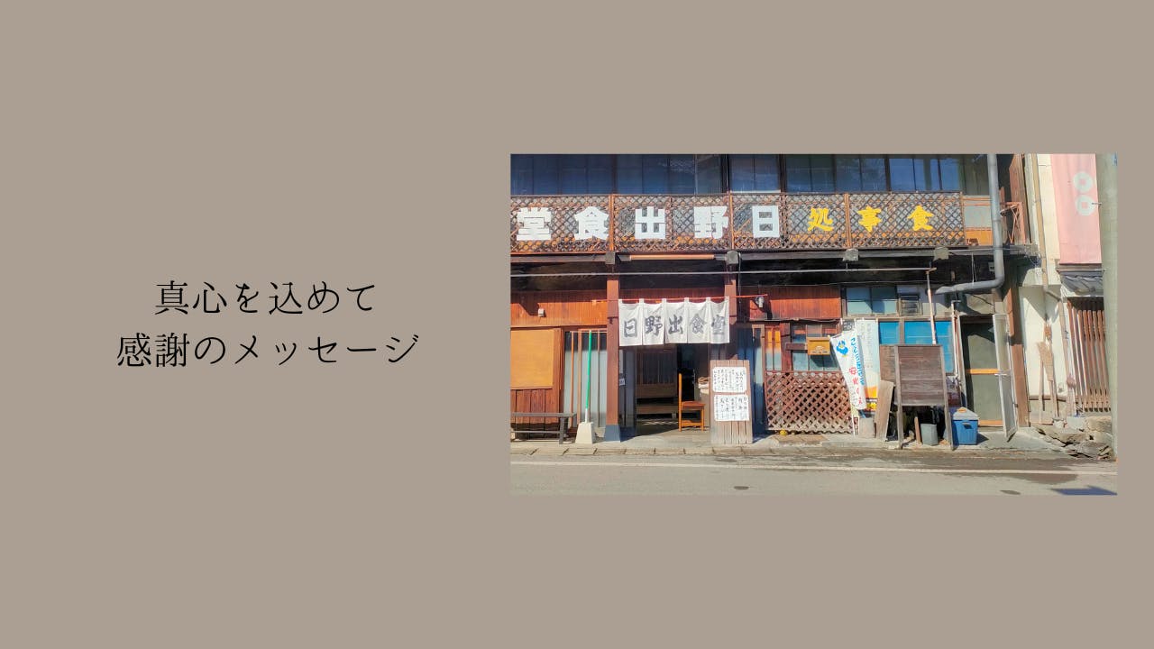 日野出食堂再生プロジェクトへのご支援、誠にありがとうございます。こちらのリターンでは、感謝のメッセージをお届けいたします。