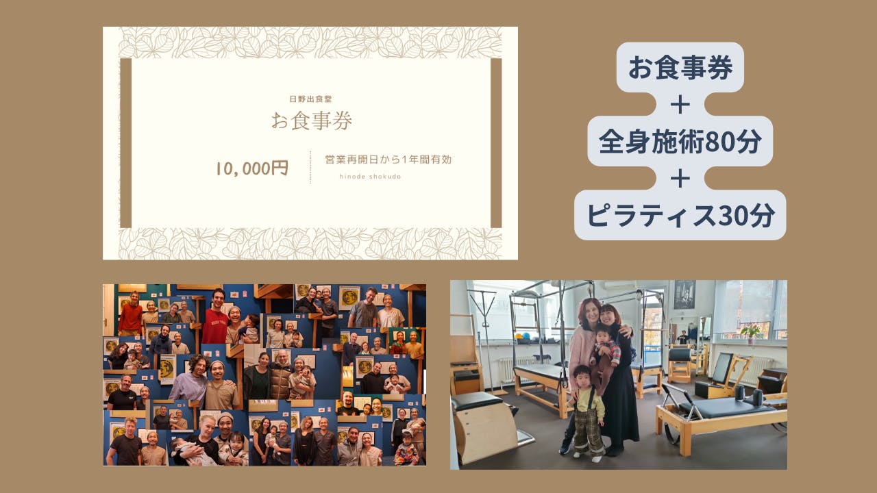 10,000円分お食事券+柔道整復師の店主によるマッサージ80分+ピラティストレーナーの妻によるピラティス30分体験一回券チケット+感謝のメール