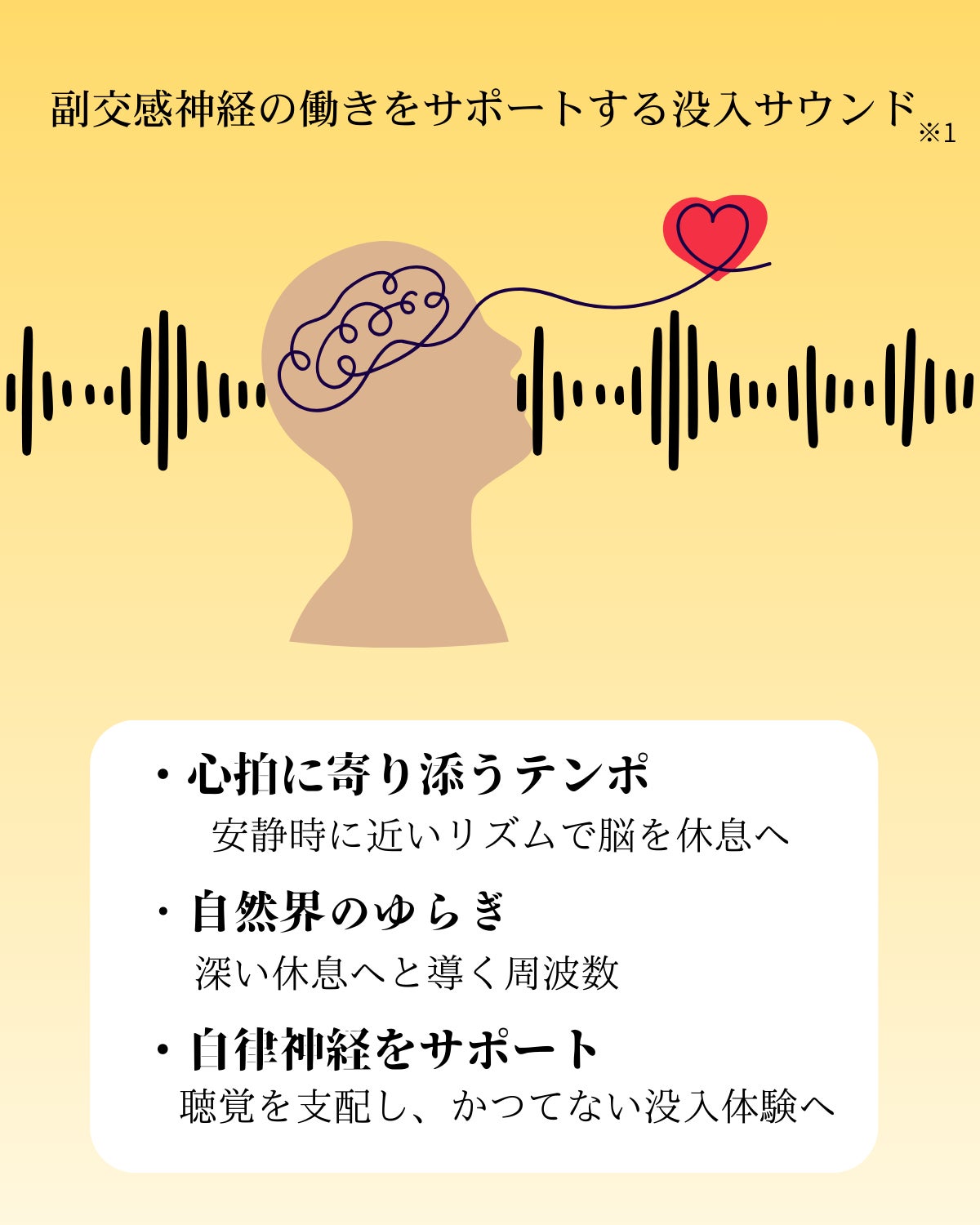 ※1 音楽のテンポや特定の周波数が、心身のリラクゼーション(副交感神経活動の亢進)に及ぼす影響に関する一般的な生理学的研究に基づき開発しています。※本製品は医療機器ではありません。