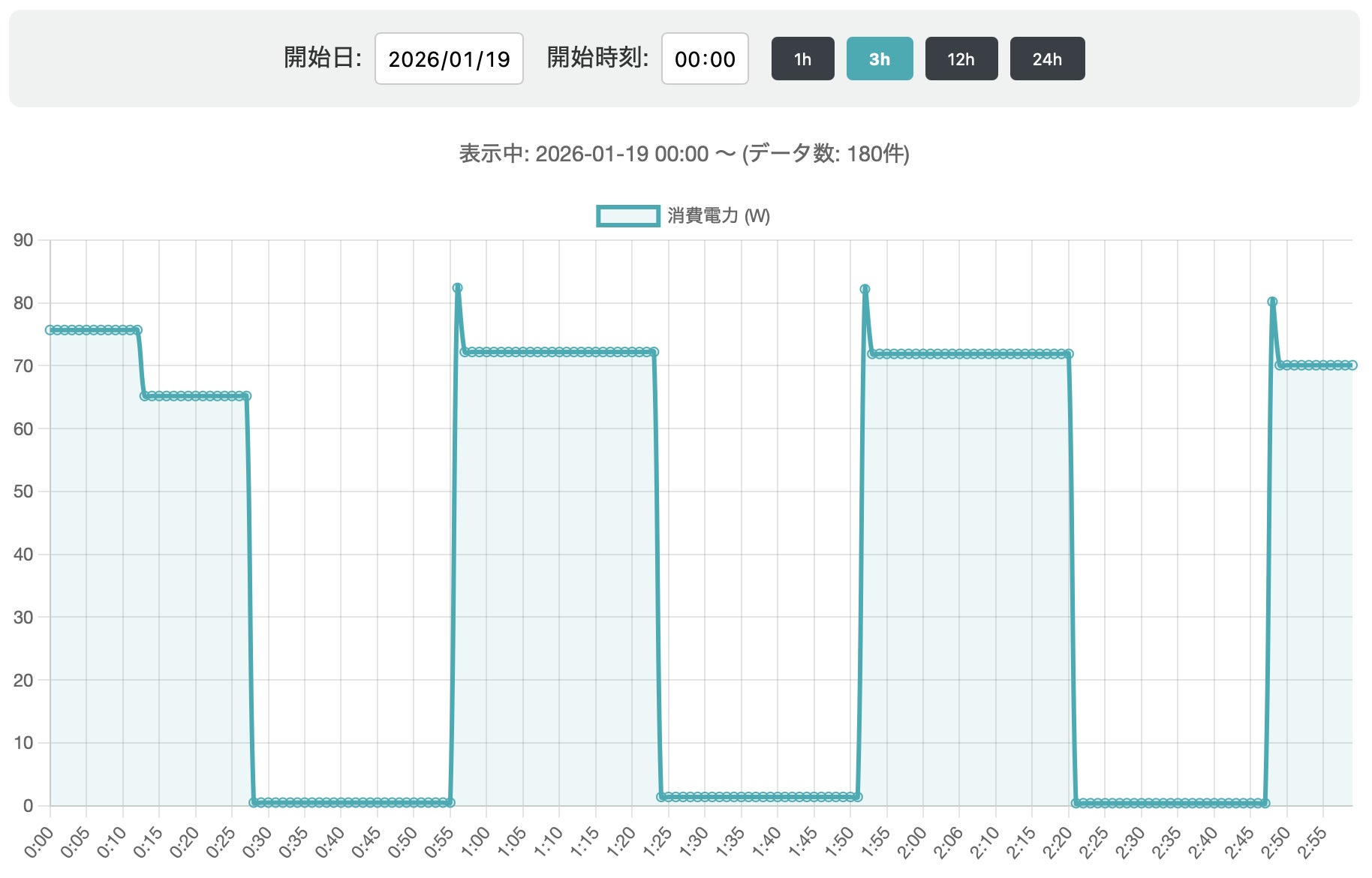 複数のデータを取得する準備として、数台で実験と検証を繰り返しています。以下の画面は支援者の方に提供する時間別の消費電力のグラフです。