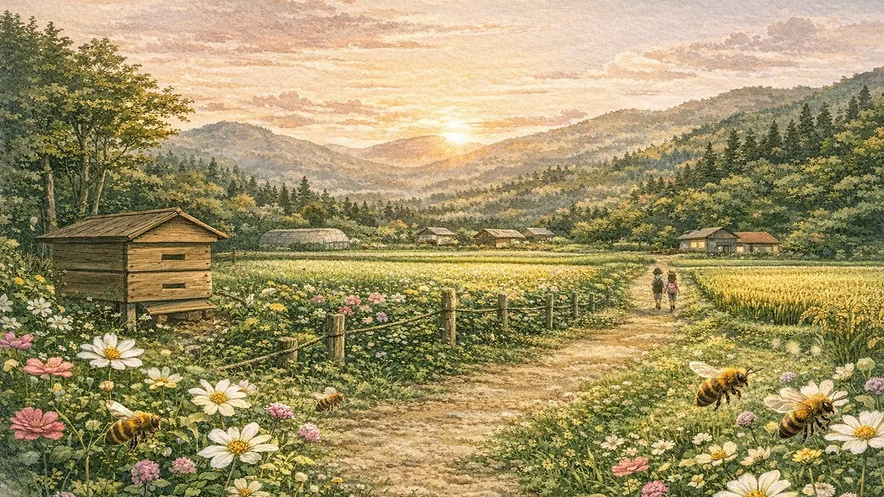 養蜂場の中だけを整えても、同じ季節は続かない。ミツバチの暮らしは“巣箱の外”——里山の環境に支えられている。