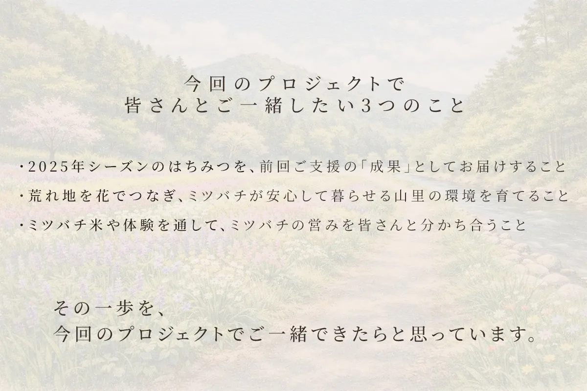 前回のクラウドファンディングでは、皆さんの温かいご支援によって、被害を受けた養蜂場で、また春を迎えることができました。本当にありがとうございました。そして今回は、そこからさらに一歩先、ミツバチたちの暮らしを支える“環境づくり”へ進むための挑戦です。