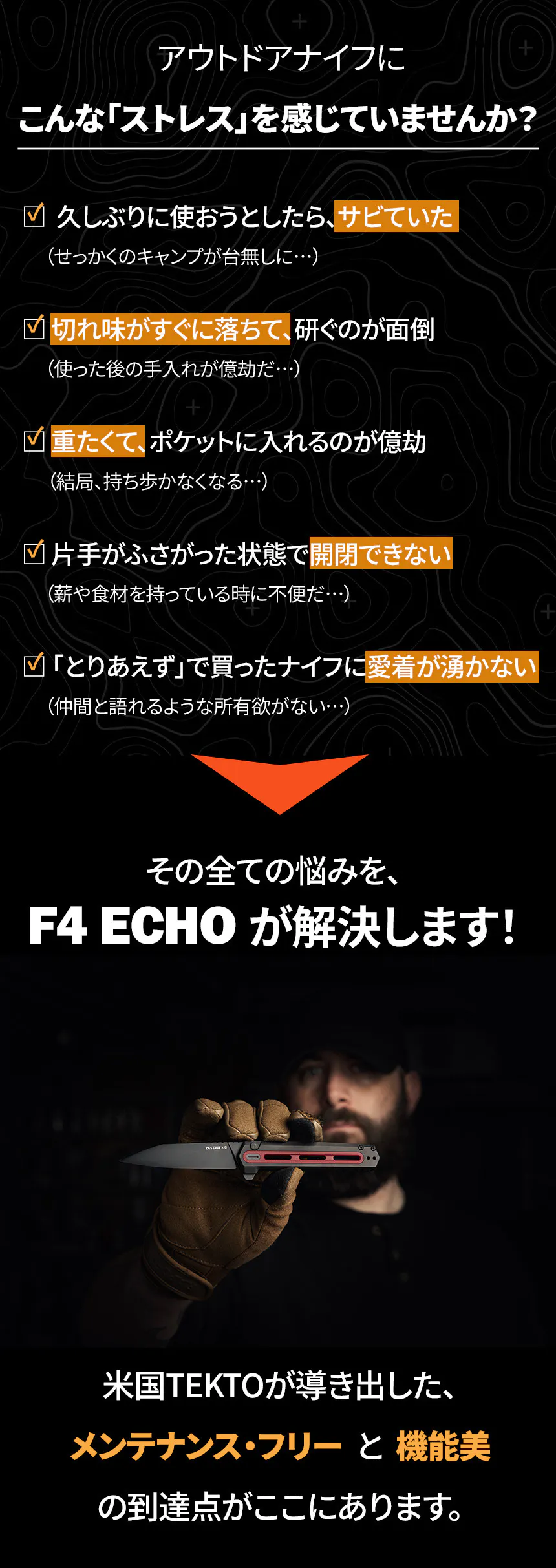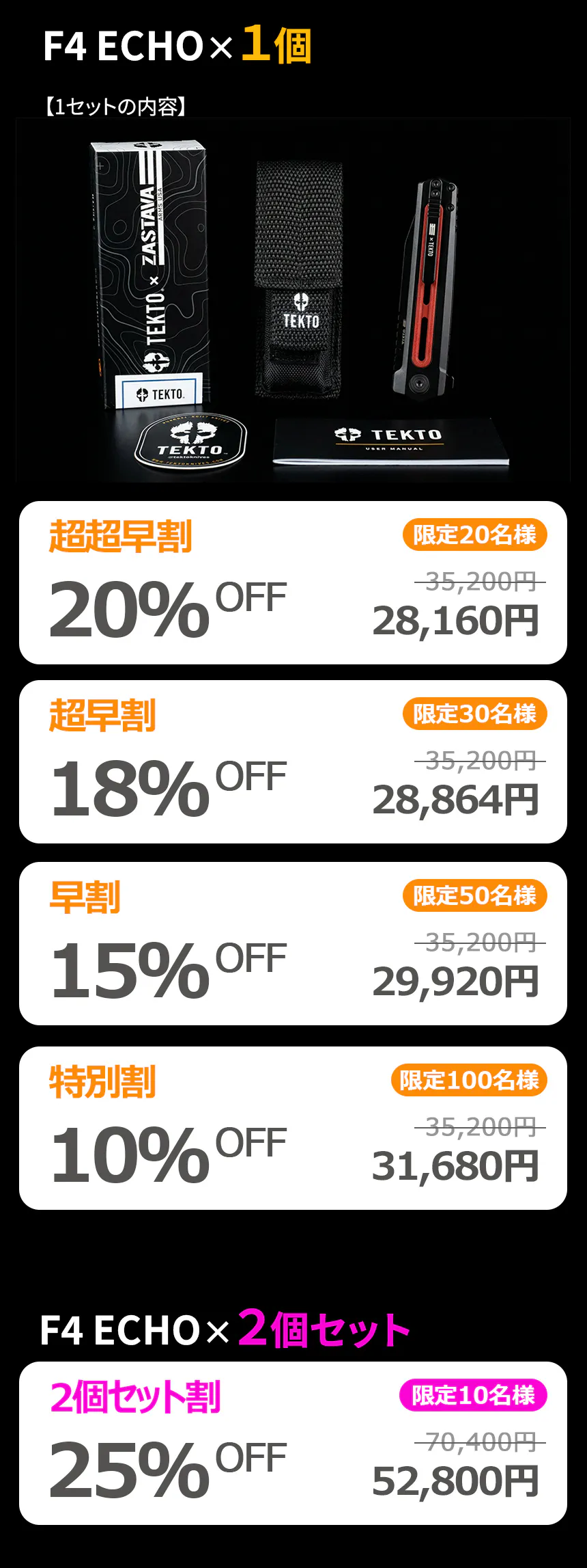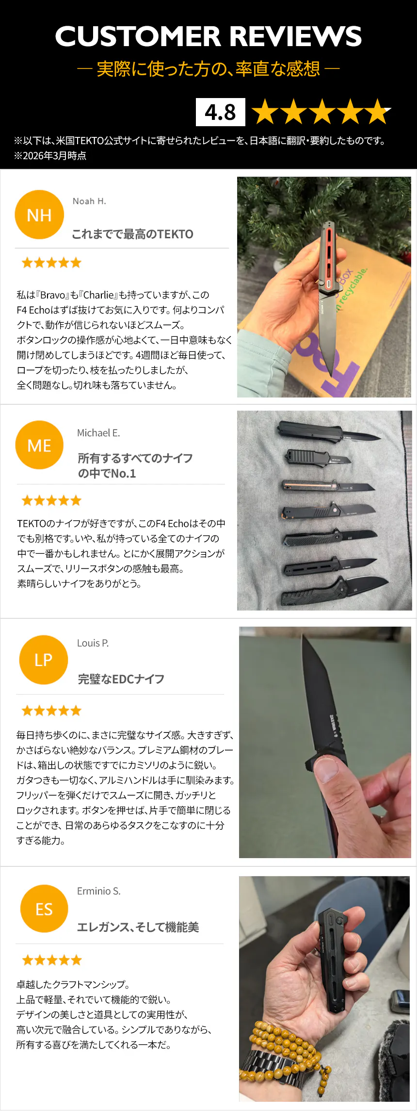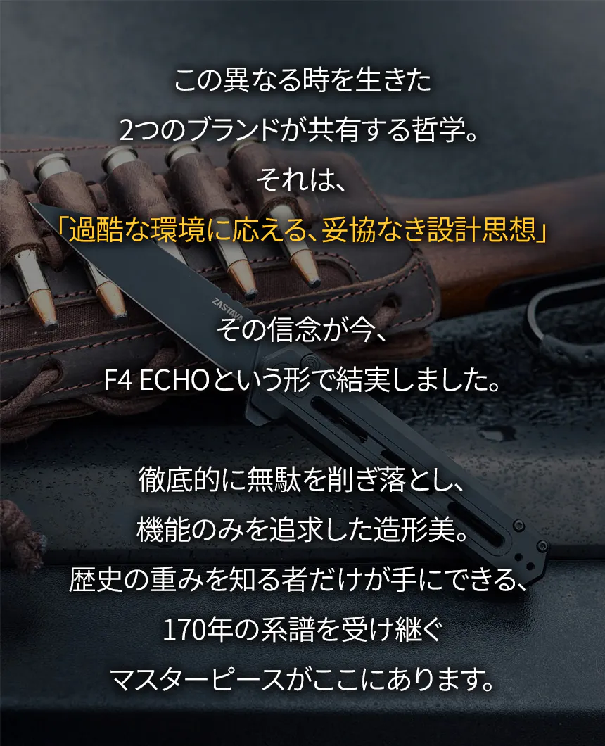 今回ご紹介する『F4 ECHO』は、伝説的銃器メーカーZastavaとのコラボレーションという、TEKTOの歴史においても特別な一本です。 メンテナンスフリーの実用性と、所有欲を満たすストーリー。 自信を持ってお届けできるこのプロダクトを、ぜひその手で体感してください。